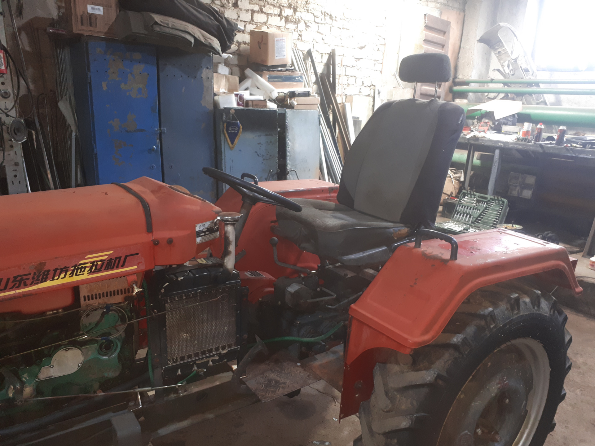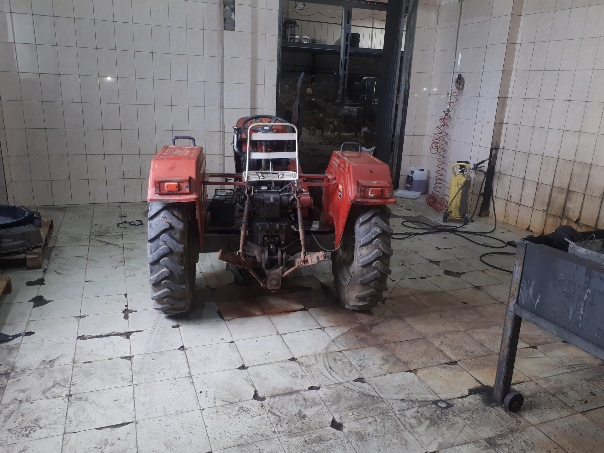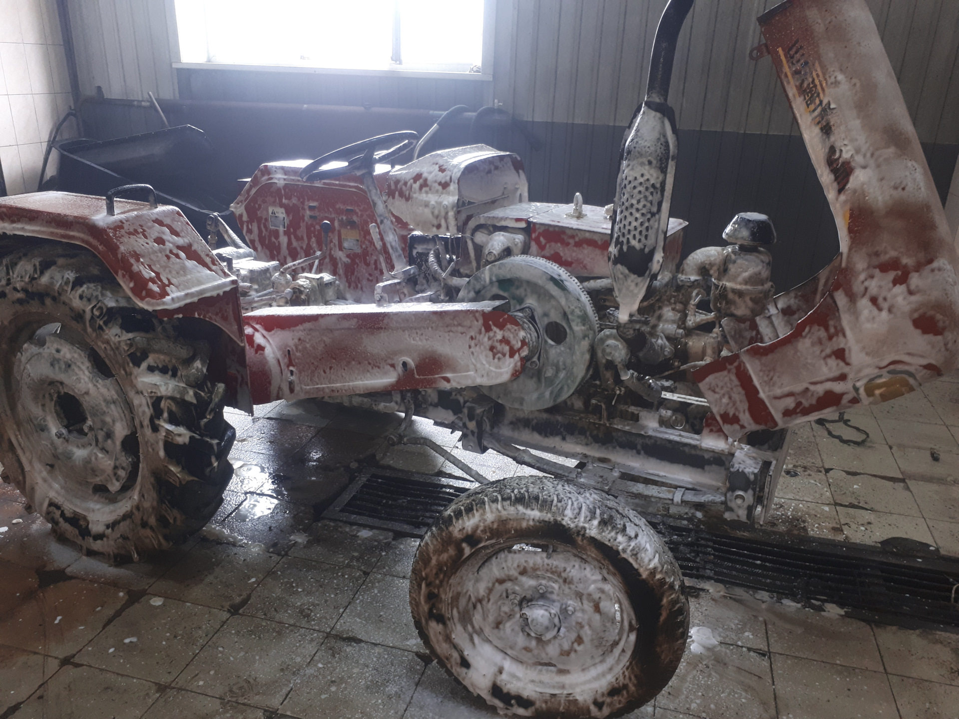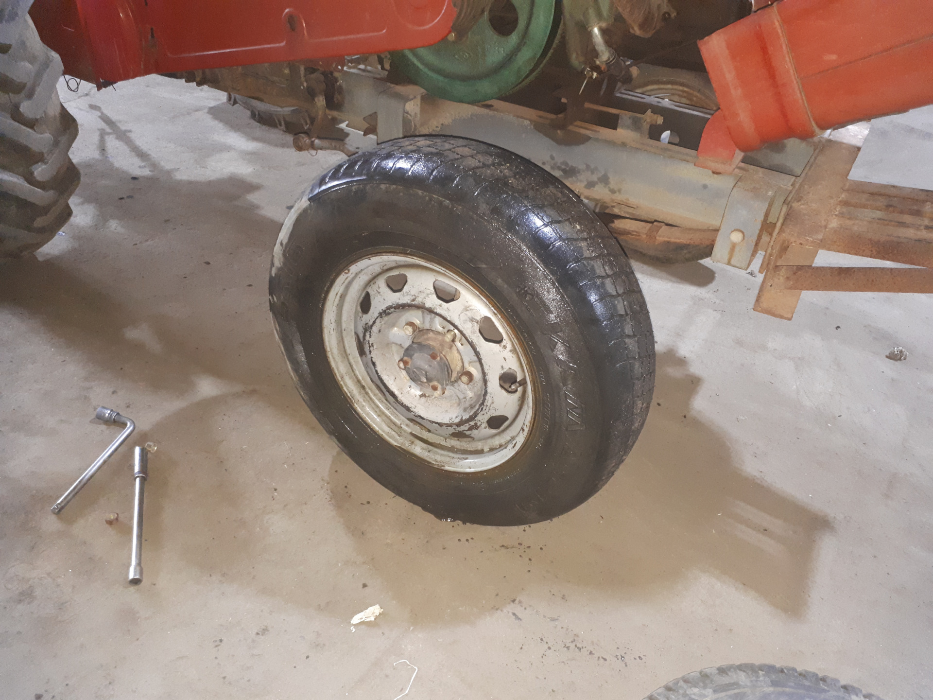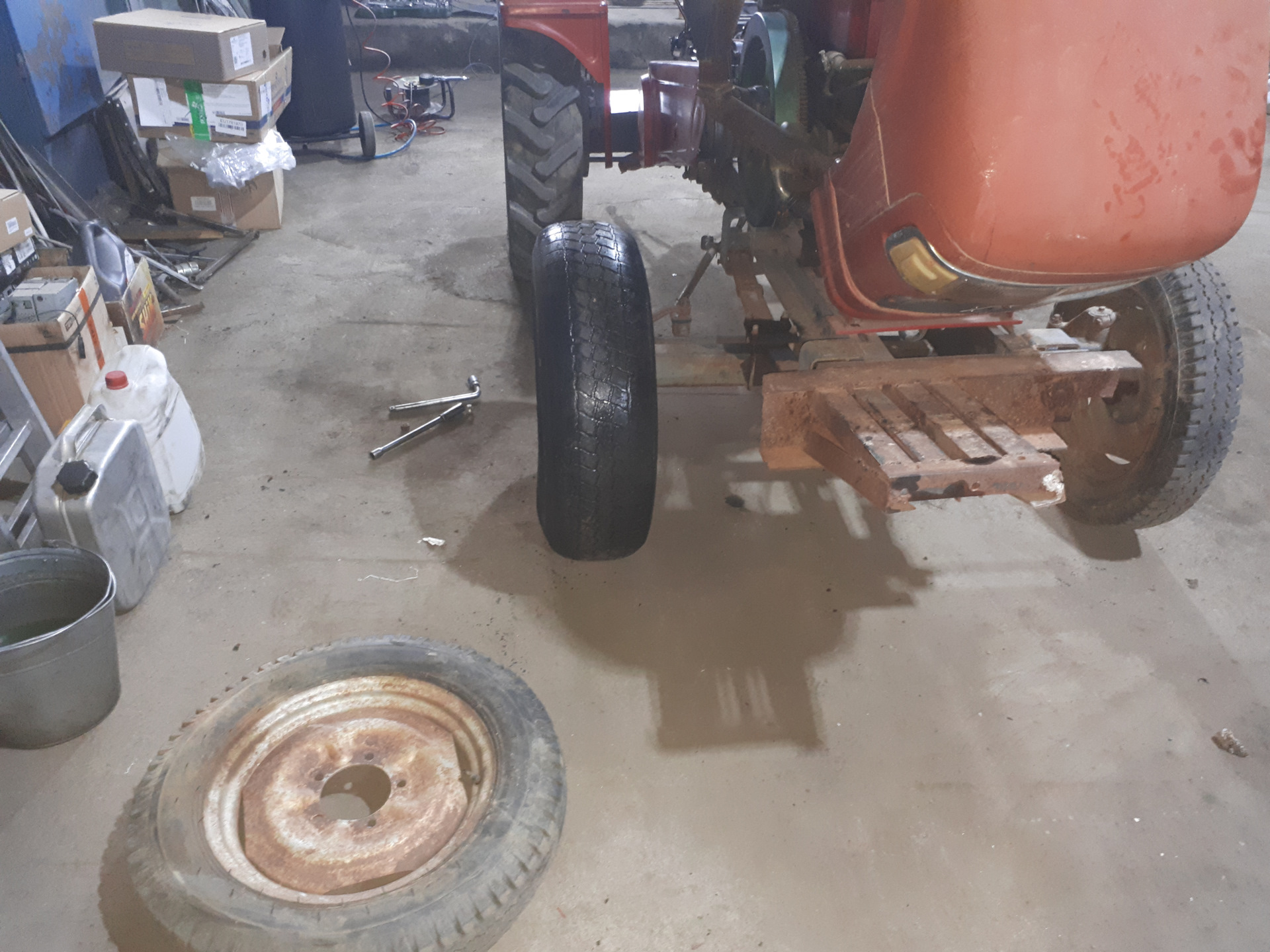 Наплавка прослабленной посадки подшипника вторичного вала.Проточка.Идеально.Купил масло в КПП и гидравлику. Приобрёл вентилятор охлаждения ДВС.Примерка УАЗовских колёс.После небольшой доработки центрального отверстия встанут как родные.Можно помыться.Пенная вечеринка.