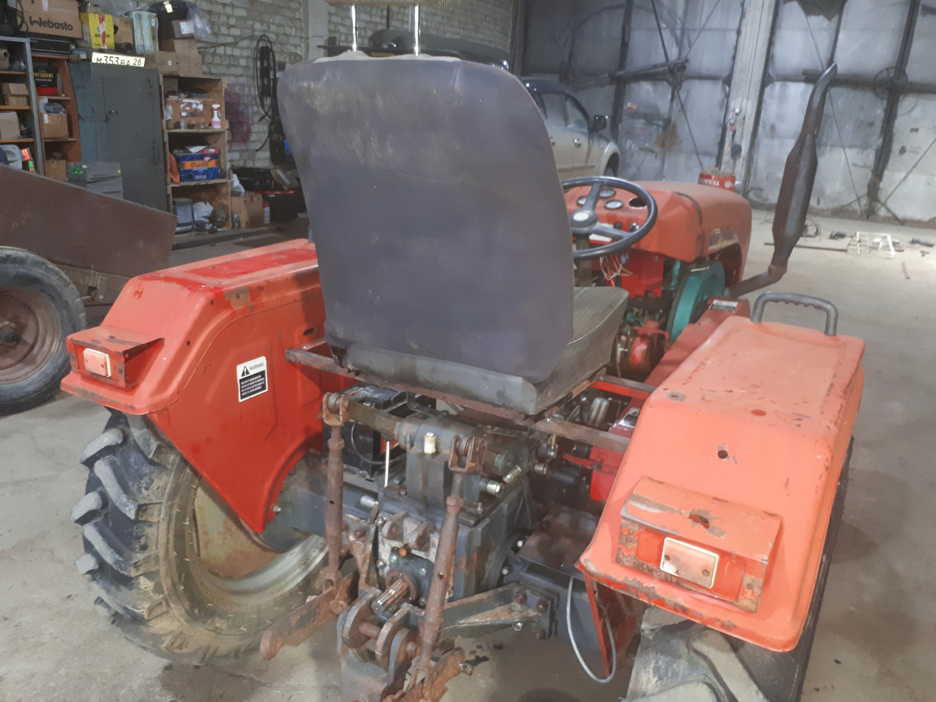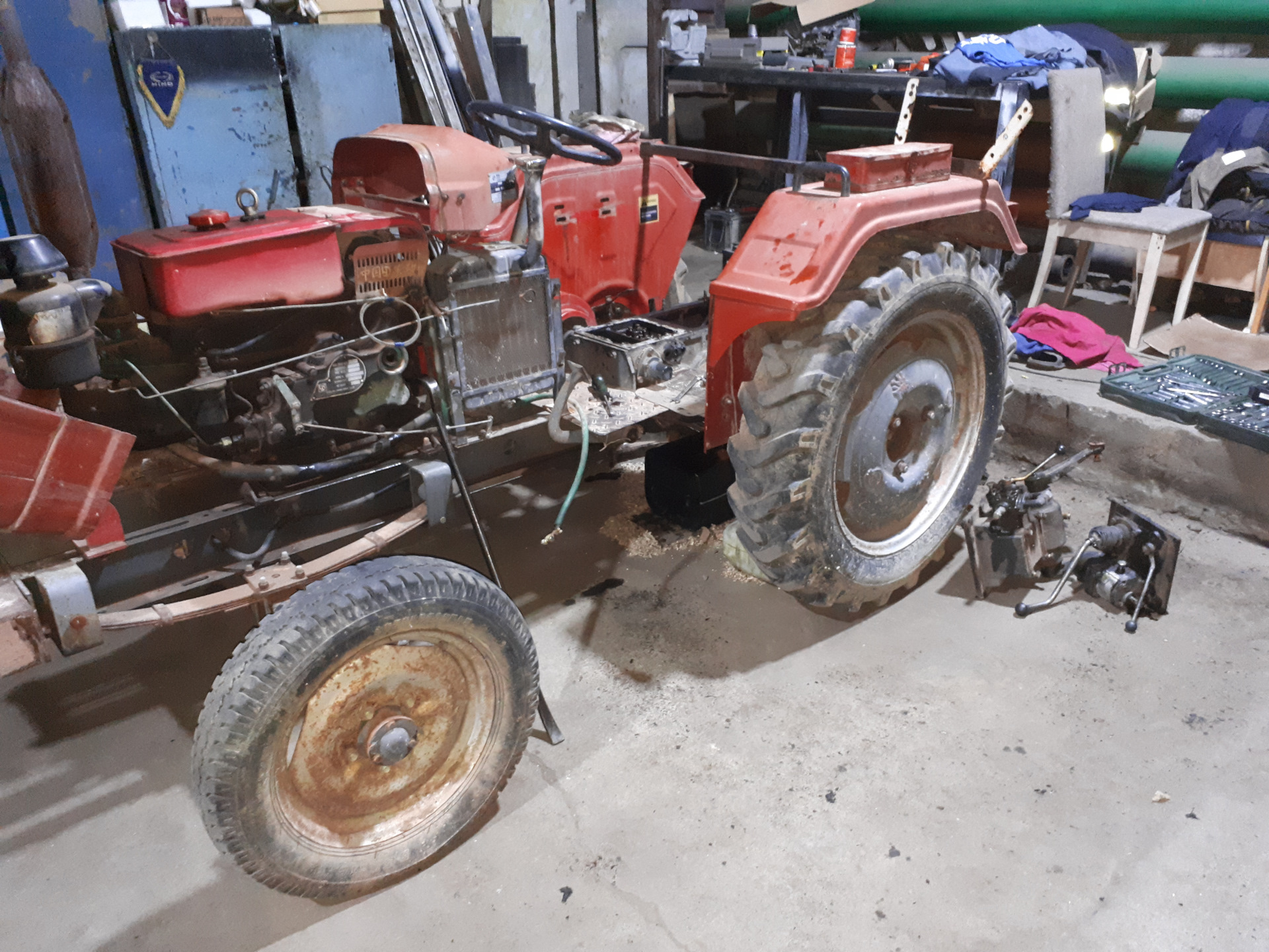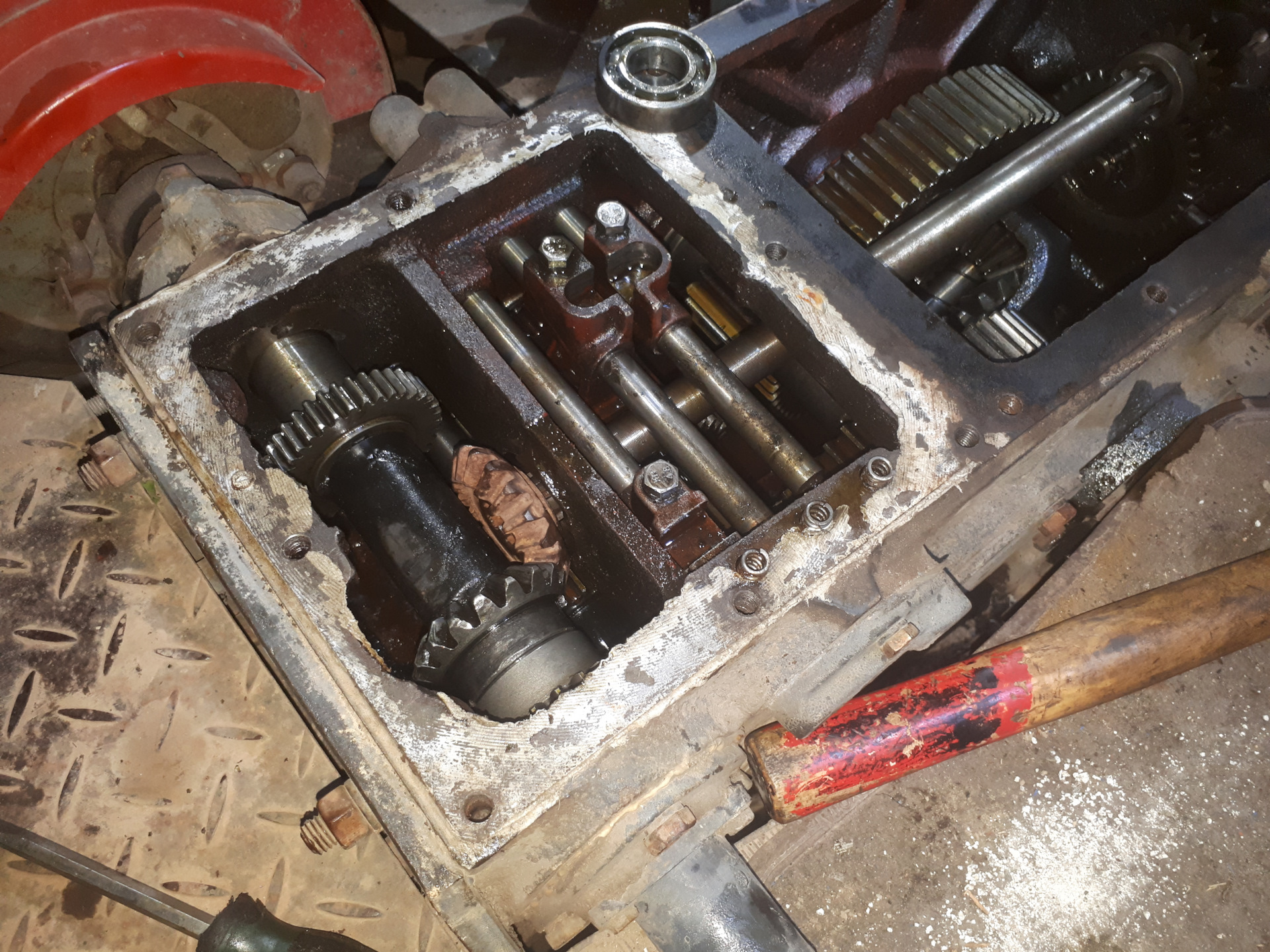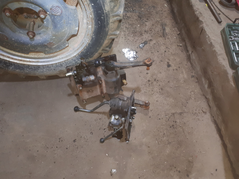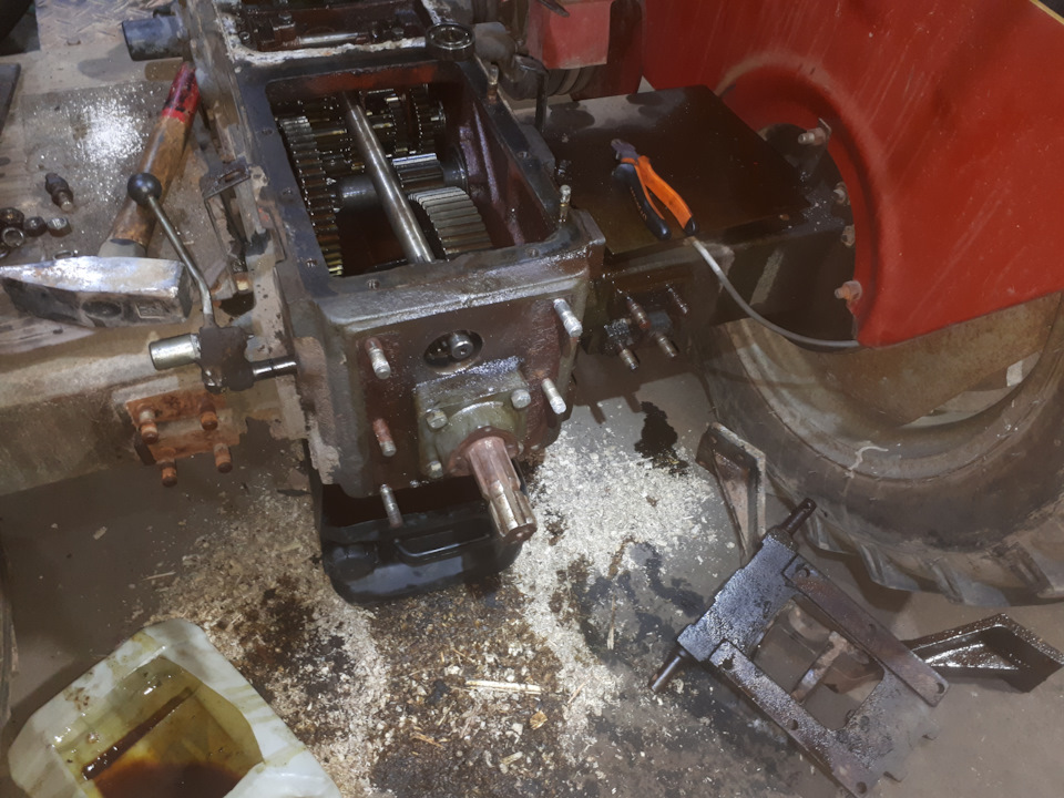 Трактор прибыл на базу для осуществления разного рода ремонтов.Установка шестерни ВОМ.Вид сзади.Кулиса и гидроблок.Общая картина.