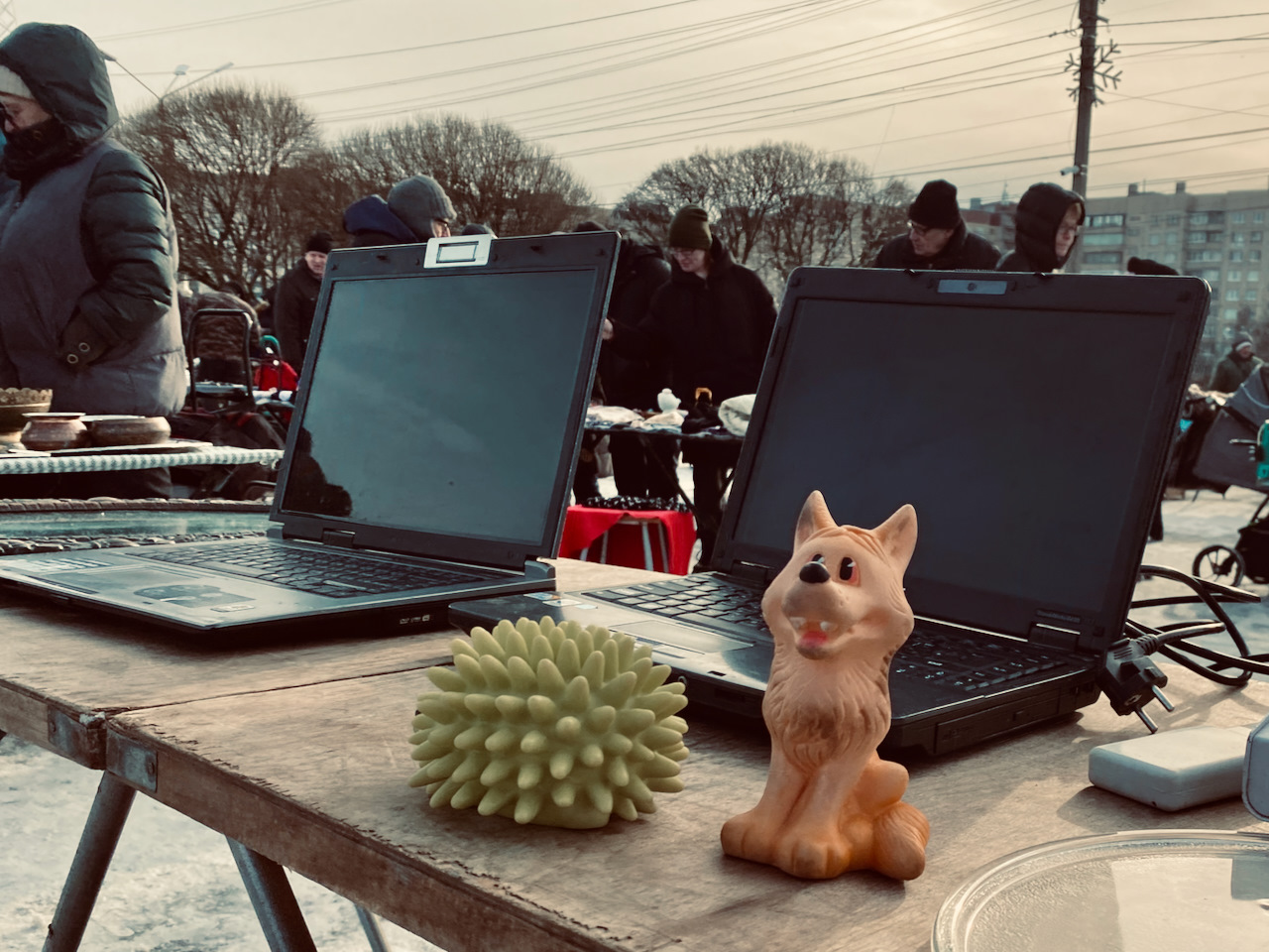 Есть и ноутбуки. Древние, но еще не антикварные. Зато в подарок дают резиновую игрушку.