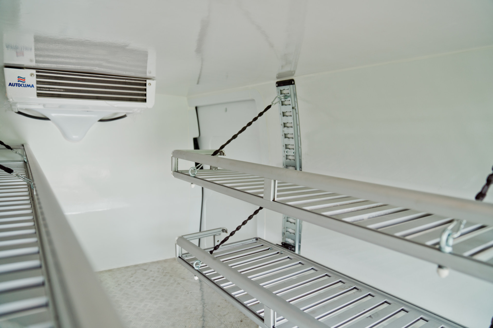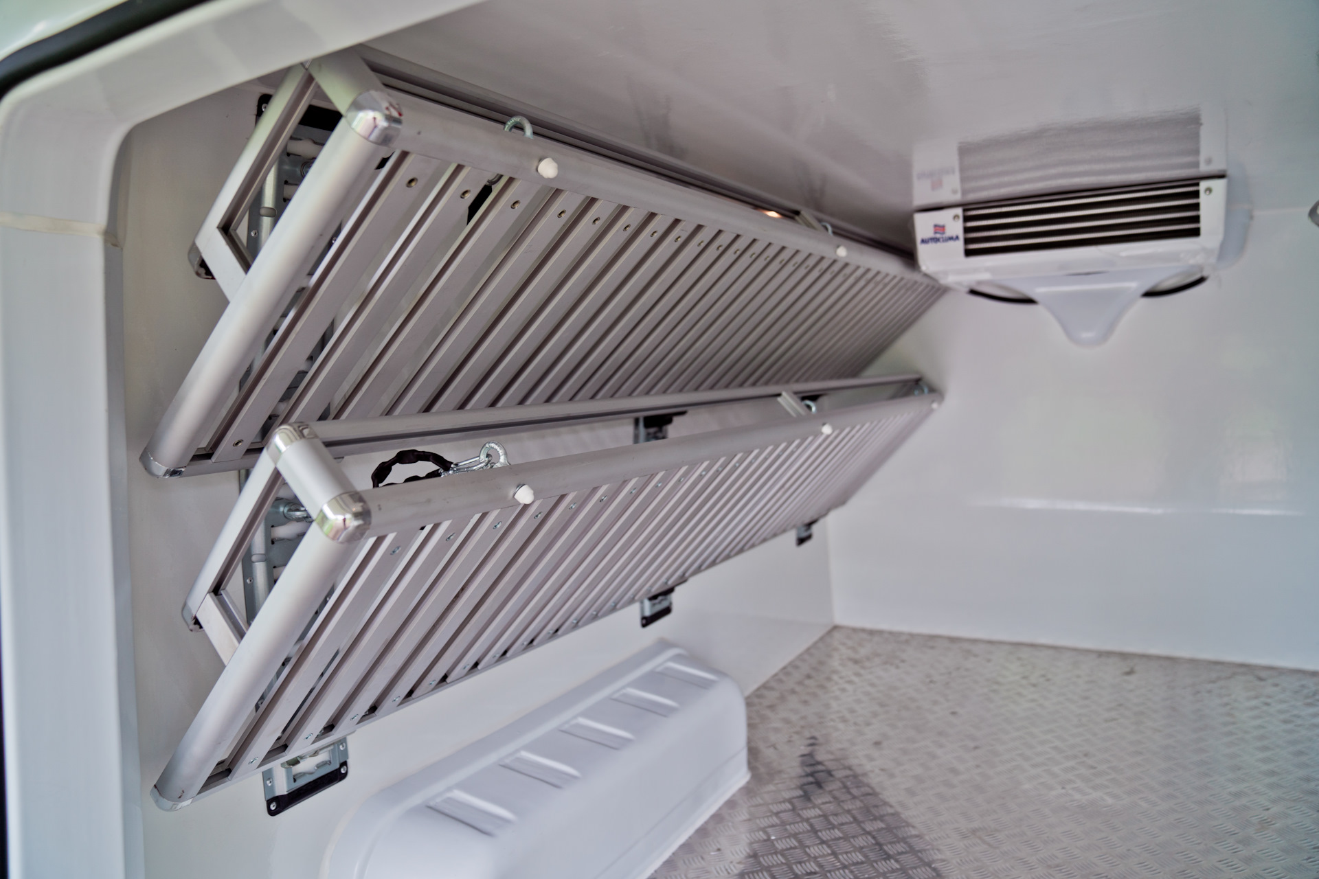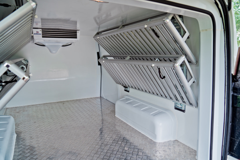 Для того, чтобы в грузовом отсеке круглогодично поддерживался необходимый температурный режим, мы установили электрический холодильный агрегат, который работает от электросети автомобиля. Данный агрегат прибыл прямиком из Италии.