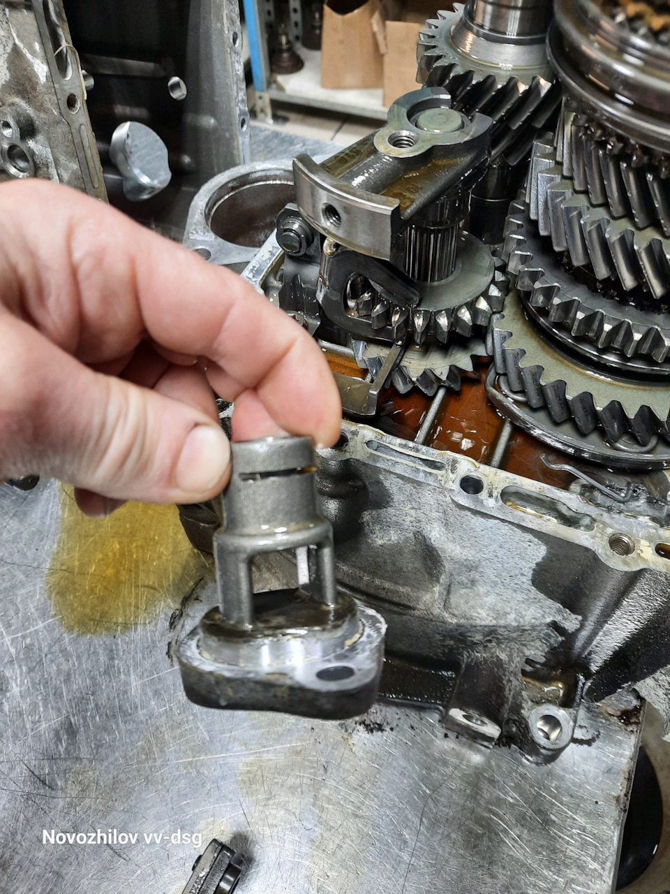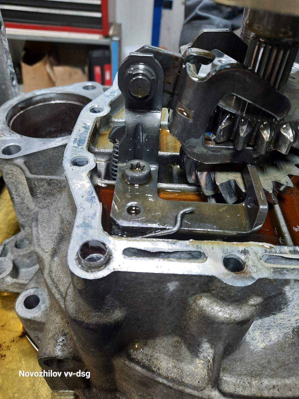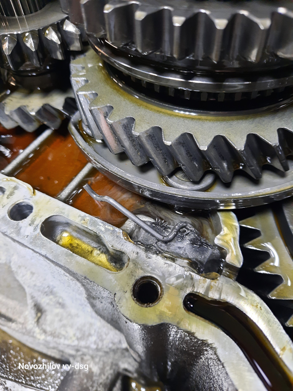 На фотографиях с "разборки" коробки, можно увидеть фрагмент поврежденной пружины, которая устанавливается в нижнюю крышку вала управления : 02J301256