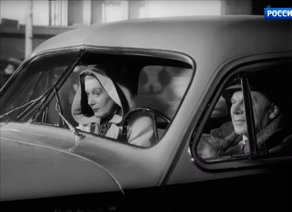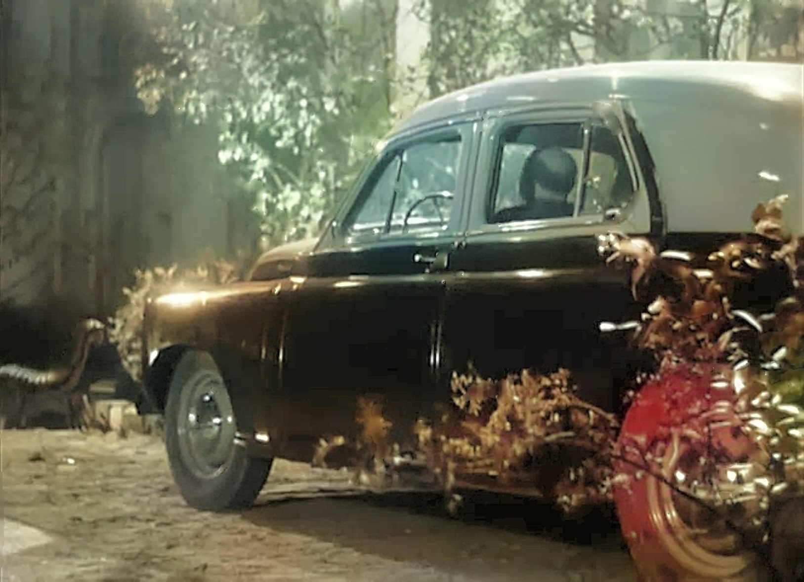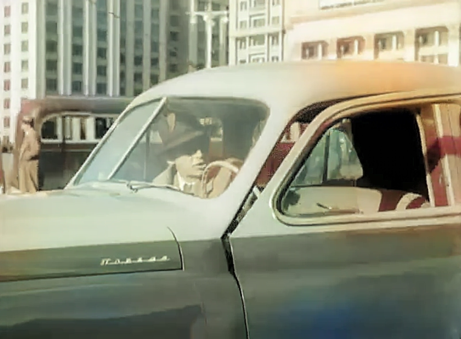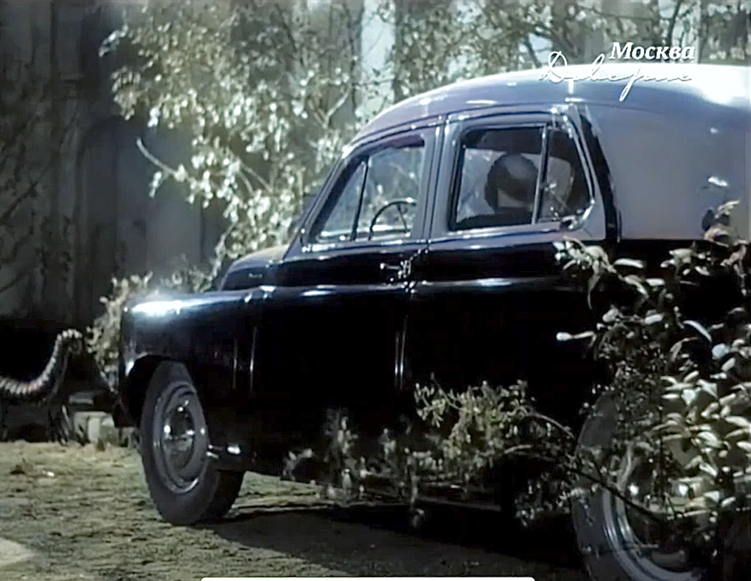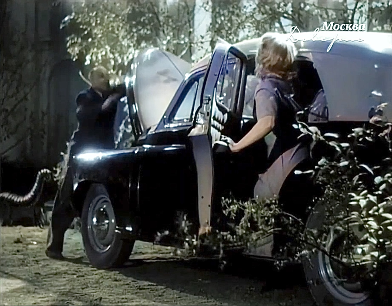Новинка (на тот момент) советского автопрома мелькает уже на первых кадрах кинокартиныТут — в отдалении, но будут и крупные планыУ этого автомобиля номерной знак города ГорькийЭто — второй игровой автомобиль. Номерной знак города Москвы. Хорошо видны отличия задней части от серийных авто.Видно наличие лючка воздухопритокаОбращает на себя внимание «короткий» капот, отсутствие люка вентиляции салона (у второй машины он есть), а также черный рульРуль побелел и появился лючок вентиляции салона:) Монтаж:)Самое примечательное тут — совершенно иная приборная панель с ленточным спидометром а-ля Зис-110Рычаг КПП, разумеется, напольный«Короткий» капот и необычное исполнение надписи «Победа»Под капотом буквально всё совершенно иначе, начиная от сигналов на моторном щите и кончая воздушным фильтром и отсутствием колпака радиатора. Очевидно, в кадре машина с 4-цил. ДВС.Тут хорошо видны отличные от серийных колпаки колес и совершенно иная арка крылаДверь тоже не вполне стандартнаяАрка крыла — кровь из глаз:) Проступила даже на фото:)Задняя дверь тоже интереснаяВертикальные фонари сильно отличной от серийных изделий формы.