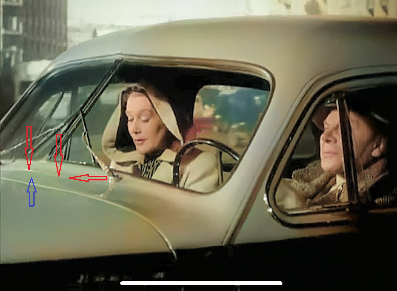 Всё-таки я сильно не доверяю любой оцветнёнке, фильм "Весна" для меня вечно чёрно-белый, как был оригинальный. 1. На одной из машин нет лючка воздухопритока? А по-моему есть, просто закрыт, а при оцветнении кадра его благополучно замазали. В пользу версии о разных машинах — разное направление дворников. Но, с другой стороны, они могут быть выключены в разных кадрах в разных положениях. 2. Чёрный руль — белый руль, это тоже лютый глюк оцветнёнки. Просто в одном из кадров на него попал свет, отразился от глянцевой поверхности обода, а оцветнили его в одном кадре как белый, в другом — как чёрный. 3. Номера разные? Да, горьковский ещё довоенный с буквами в углу, а московский классический образца 1946-го. НО! Мне ли, как профессиональному шофёру игрового транспорта, не знать, как киношники на площадке меняют номера — многократно, непредсказуемо и по-дилетантски наплевательски к этому относятся. Думаете, чего-то изменилось за прошедшие 75 лет?! Ха-ха — как бы не так! 4. А ВОТ ЧТО я в натуре оценю, так это укороченные сзади передние крылья с выступающими на боковину краями моторного щита. ВОТ ЭТО — действительно признак опытных М-20. 5. "Ленточный спидометр"? Не ленточный с указателем скорости лентой, ползущей по шкивам (как у ГАЗ-24 или ФИАТ-1800), а стрелочный, с указанием стрелкой, но с горизонтальной шкалой — именно такой был у ЗИС-110. Осталось только выяснить, с какой иномарки его сняли в КЭО ГАЗа, чтобы, за отсутствием оригинального, поставить на опытные М-20. Необычный воздушный фильтр тоже небось от какой-то американской машины — когда ещё нет оригинальных комплектующих, ставят то, что подойдёт по месту от существующих машин.