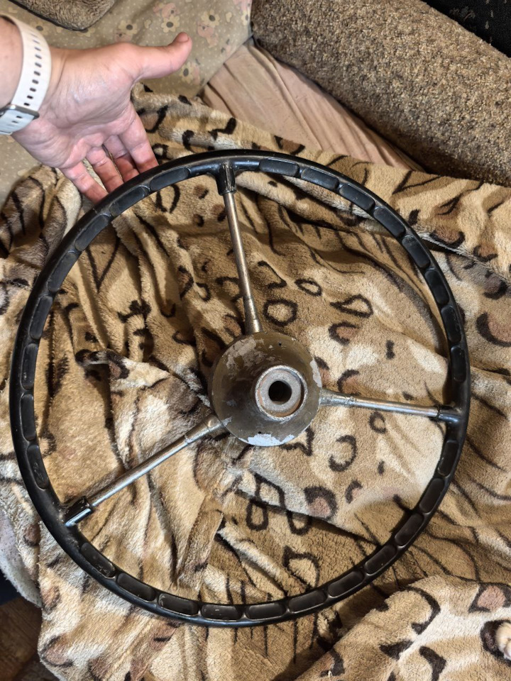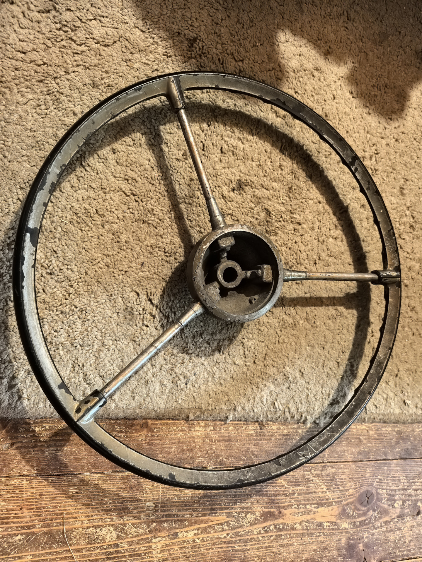 Никакой. Совсем. Как и отливки/отверстий для крепления кнопки сигнала. Спицы расставлены по-победовски, к центру прикреплены тоже, как на рулях второй серии. Диаметр 440 мм. Краска на ободе когда-то, видимо, была светло-серой.