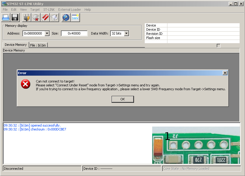 — подключить вывод №3(RST) на разъеме J2 на GND адаптера ST-Link, чтобы контроллер находился в сбросе и родная прошивка не успела заблокировать SWD интерфейс