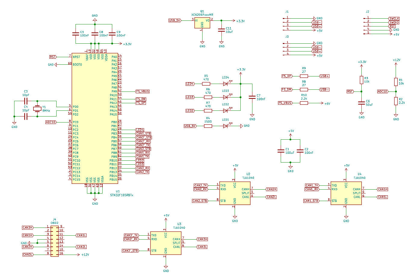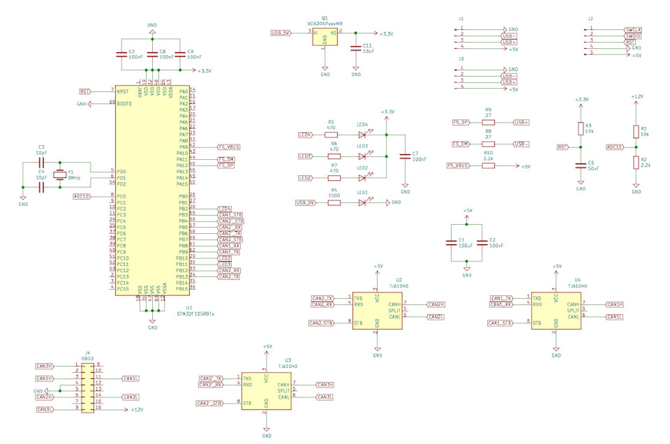 С помощью мультиметра я прозвонил соединения и нарисовал схему, получившаяся схема отличается своей простотой, граничащей с дешивизной. На схеме нет ничего лишнего, сэкономили как на защите от помех для шины USB так и для шин CAN, поэтому о гальванической изоляции не стоит даже и мечтать. В схеме самый минимум элементов: адаптер питается от шины USB, питание 12 Вольт с OBD2 разъема заходит только на вход АЦП, есть 3 светодиода, терминирующих резисторов нет. Так как в микроконтроллере STM32f105RBT6 только два физических CAN интерфейса, третий CAN интерфейс коммутируемый и в один момент времени может использоваться только два CAN интерфейса.