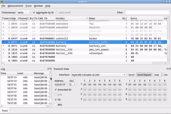 Cangaroo — это простая программа для отправки и приема CAN сообщений, написана на Qt/C++ исходники доступны на гитхабе. Т.к. эта программа написана на Qt/C++, то она может работать в Windows и Linux, а при желании ее можно заставить работать в MacOs, Android и IOS, т.к. фреймворк Qt поддерживает эти ОС. Я слегка модифицировал программу cangaroo, чтобы она могла работать одновременно с двуми каналами адаптера ucds при использовании прошивки gs, готовая программа для Windows доступна для скачивания с гитхаба: cangaroo.exe, а мои изменения можно увидеть здесь. Функционал программы cangaroo схож с функционалом немецкого canhacker, но только программа cangaroo может работать с различными типами адаптеров, поддерживает расшифровку сообщений из DBC файлов и открыта для модификаций и нового функционала.