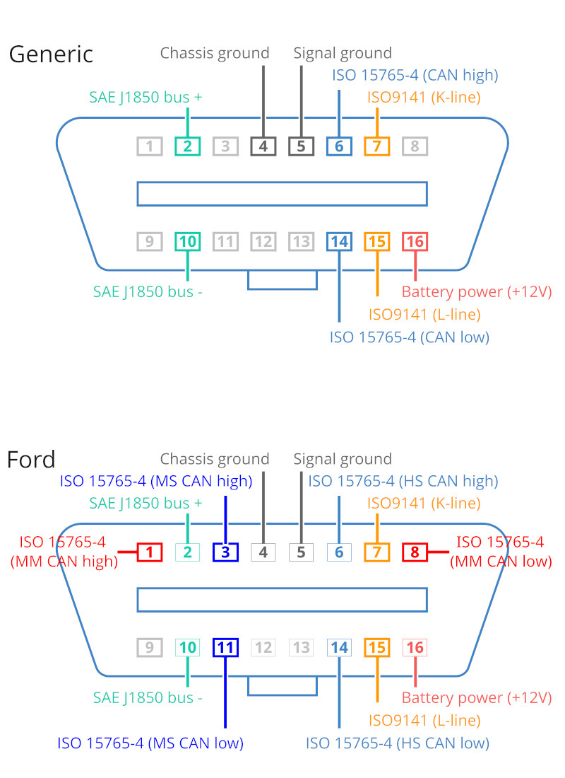 Ниже приведена стандартная и Ford-овская распиновки OBD2-разъемов, если смотреть на разъем в автомобиле, распиновка со стороны адаптора будет зеркальной.
