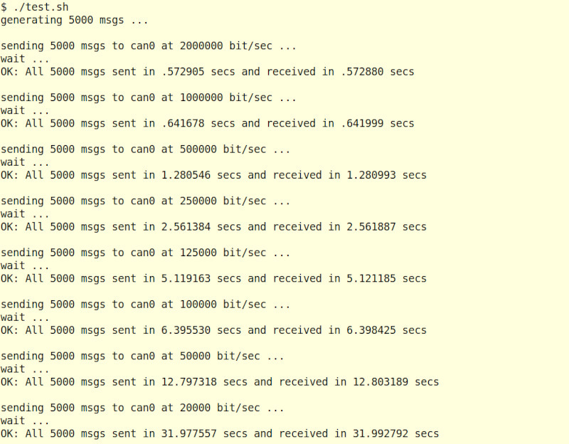 Для проверки функционала прошивки и производительности адаптера в режиме gs я использовал простой нагрузочный тест, в дереве исходников он называется test.sh, в тесте на различных скоростях передается 5000 пакетов с различными данными из первого интерфейса на второй с проверкой приема всех пакетов, тем самым полностью загружаются оба CAN интерфейса адаптера и шина USB. Перед запуском теста линии HSCAN адаптера необходимо соединить с линиями MSCAN адаптера и дополнительно нагрузить терминирующим резистором номиналом 60 Ом, т.к. в самом адаптере нет терминирующих резисторов. Сам тест написан на обычном bash с использованием обычных для ОС Linux команд, причем для работы с CAN адаптерами в ОС Linux никаких драйверов или дополнительных программ устанавливать не надо, сразу после подключения адаптера через него можно взаимодействовать с шиной CAN.