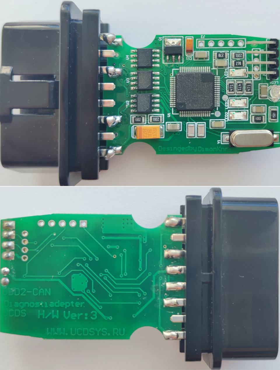На фото видно, что на плате ucds адаптера распаяны микронтроллер STM32f105RBT6 и три CAN-трансивера TJA1040, предположительно присутствует разъем для программирования. Надпись на плате говорит что это ucds адаптер версии 3. Разводка дорожек на плате позволяет нарисовать схему адаптера почти полностью только по фото, поэтому я заказал такой адаптер на али.