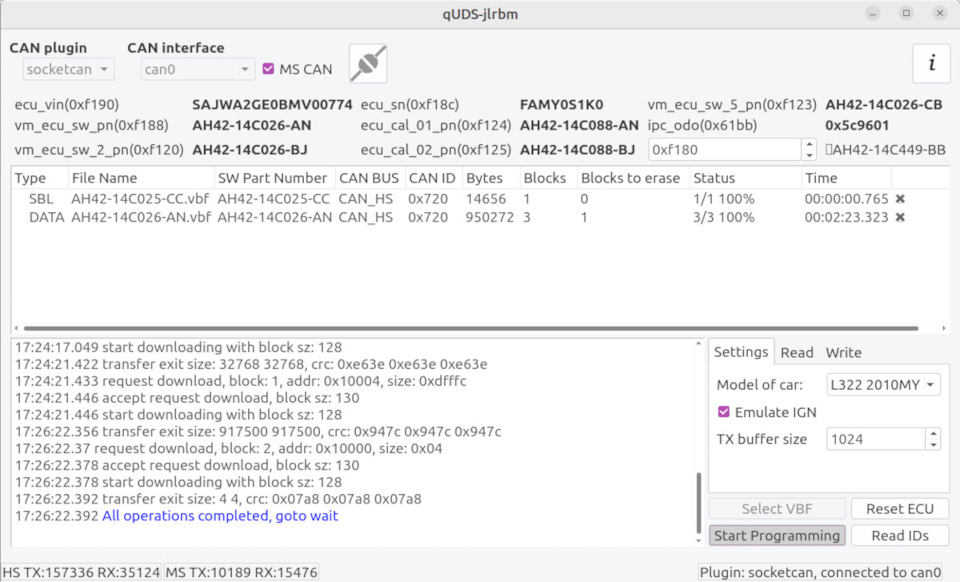 Ниже скриншот из программы предназначенной для прошивки изображений в приборную панель, запущенной в OC Linux, время прошивки файла AH42-14C088-BJ.vbf, размером в 1МБайт, составляет 2 минуты и 23 секунды. Данное время складывается как из времени передачи в шине CAN так и из времени записи данных во внутренний накопитель приборки, поэтому это время больше чем просто время передачи файла по шине CAN размером в 1МБайт.