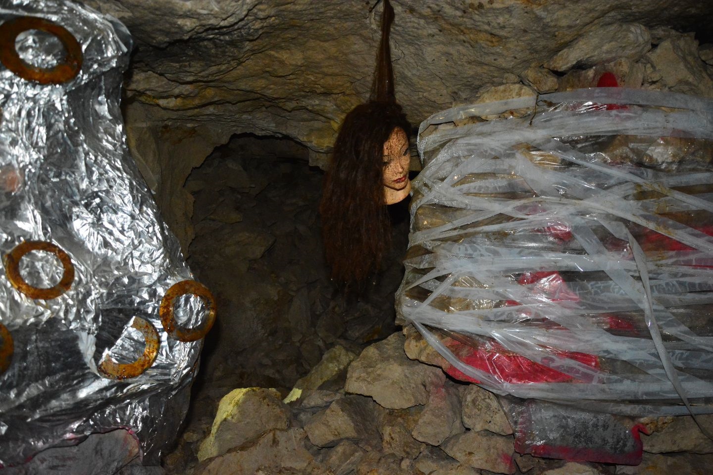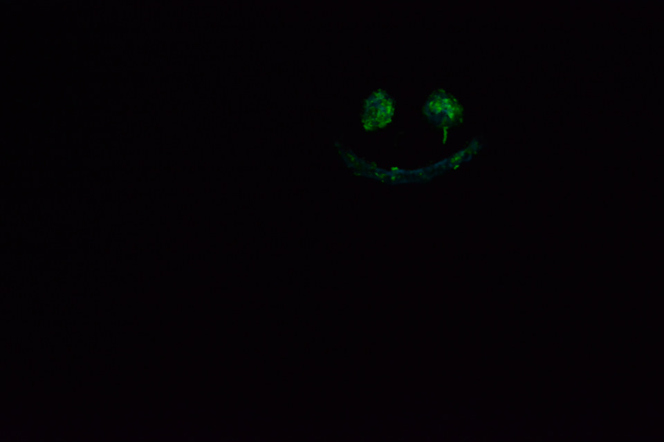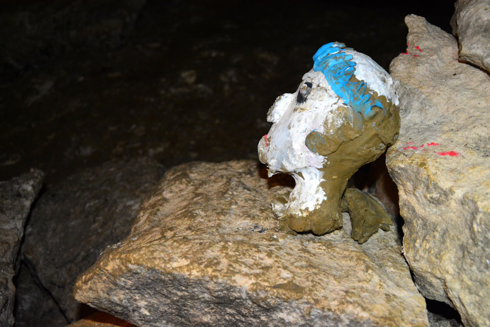 Глюк, наверное, одно из самых запоминающихся мест. Подвешенный к потолку камень, на котором флуоресцентной краской нарисовано лицо. Заряжаем светом, и остаемся в темноте вместе в этой веселой рожицей.
