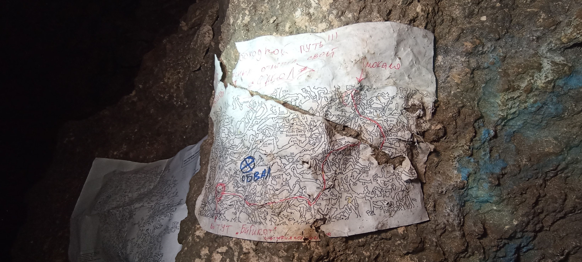 Тут же на камне отсыревший кусочек карты, где обозначен обвал и прорисована часть маршрута, где его можно обойти. Сунулись туда, а там мало пикетов, не зря при входе написано Леший. Короче, сделали круг, сами не поняли как, потеряли двадцать минут, и приняли решение вернуться к Бигимоту и идти на выход.