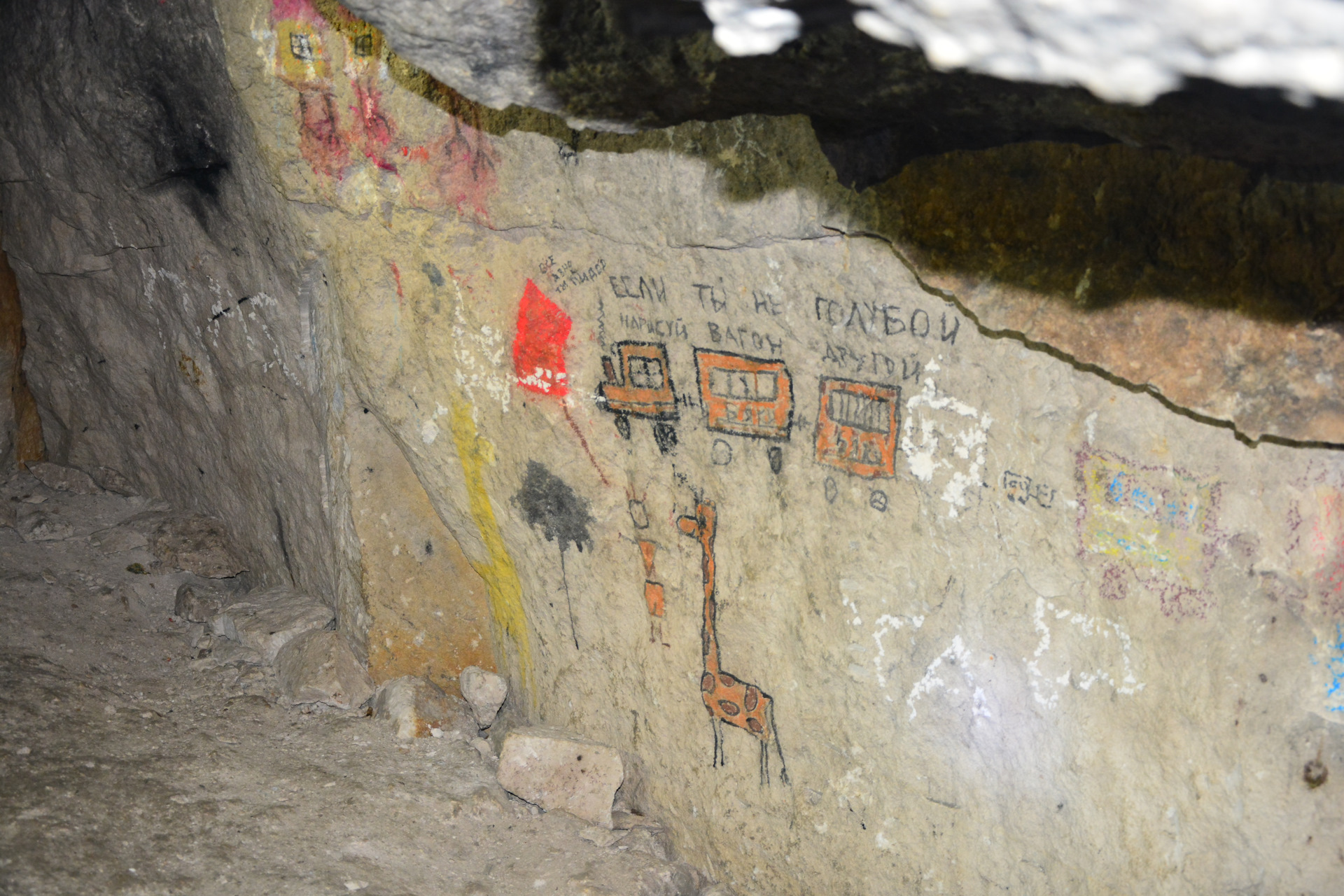 Какие-то залы, где можно встать во весь рост, просто с надписями, типа, смерть завпиту. Какие-то с «фишками», вроде Глюка или табличек, притащенных сюда спелеологами. Очень интересно, даже если уже бывал в пещере, всегда найдется что-то, что еще не видел.