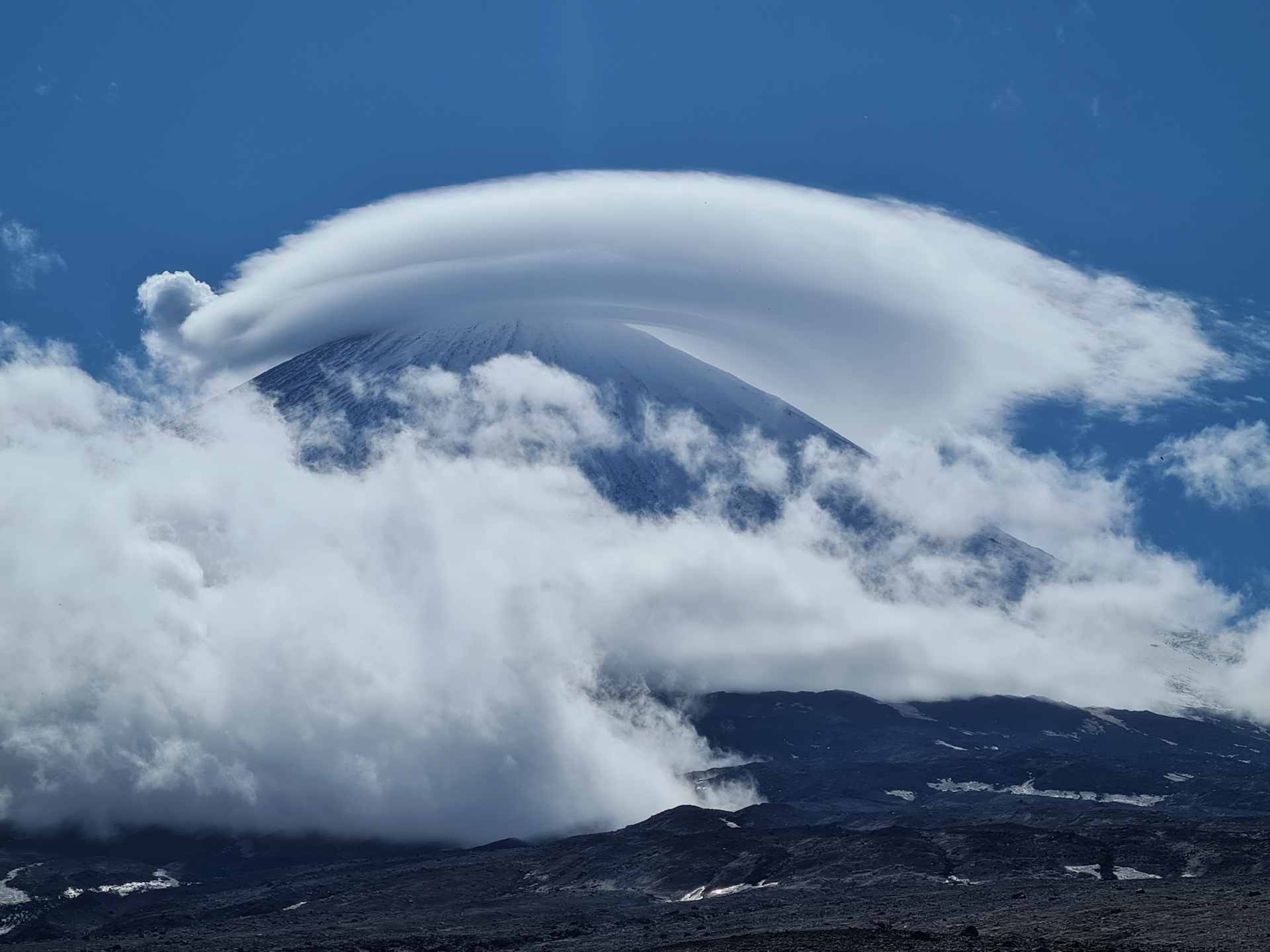 Небольшой ветерок сдул облако с вулкана, оставив на нем круглую вуаль. Мы все в восторге! Ключевская манит и притягивает нас, но вместе с тем, я чувствую, что это холодная и опасная гора. Бывает, знаете, такое ощущение таинственности, загадки. И как будто недружелюбного приема, как будто впереди нас ждало что-то очень пугающее. Голова была полна стресса, а впереди – более километра набора высоты до хижины на 2600м. Ноги и спина уже начали понимать, как им будет тяжко, но солнце начало двигаться в сторону заката, поэтому идти будет уже не так жарко.