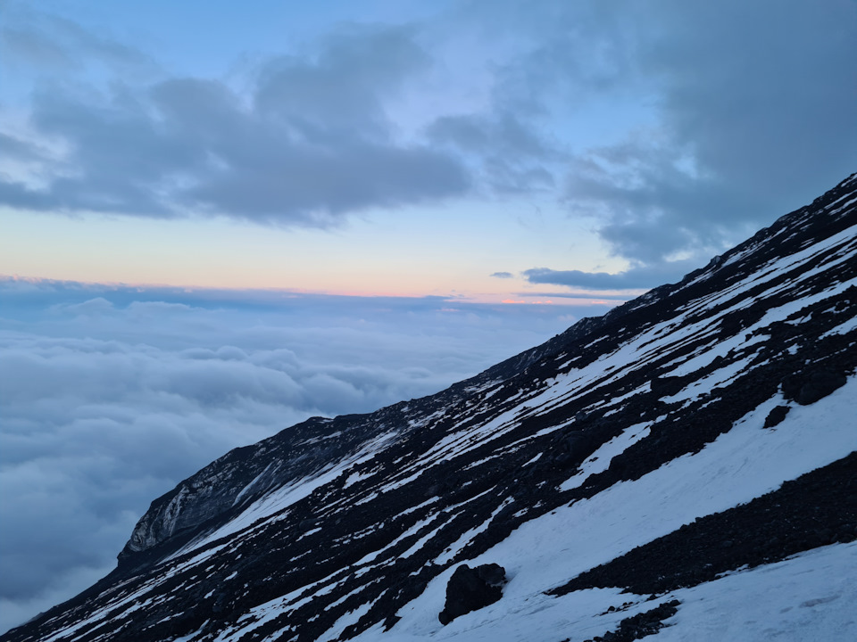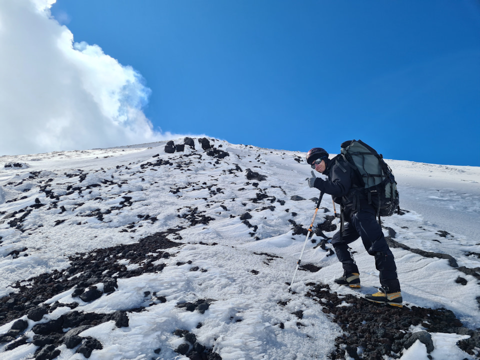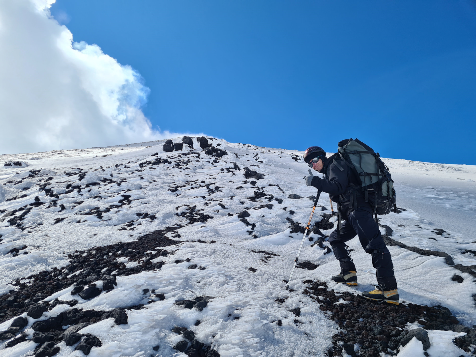На 4300 я вдруг понял, что еще пахать и пахать. Спросил нет ли у нас каких-то дедлайнов, то есть времени, после которого мы точно разворачиваемся вниз. На что Владимир твердо ответил – такого времени нет, идем как идем (хорошо быть единственным туристом!). Меня это полностью устраивало, важно было рассчитать силы, в тч на случай спуска в непогоду. Поэтому я не рвался наверх как можно быстрее, но и не рассиживался на остановках. Старался постоянно идти с небольшой скоростью пока погода хорошая. Ведь если повезет, то мы увидим кратер и даже, может, лаву!