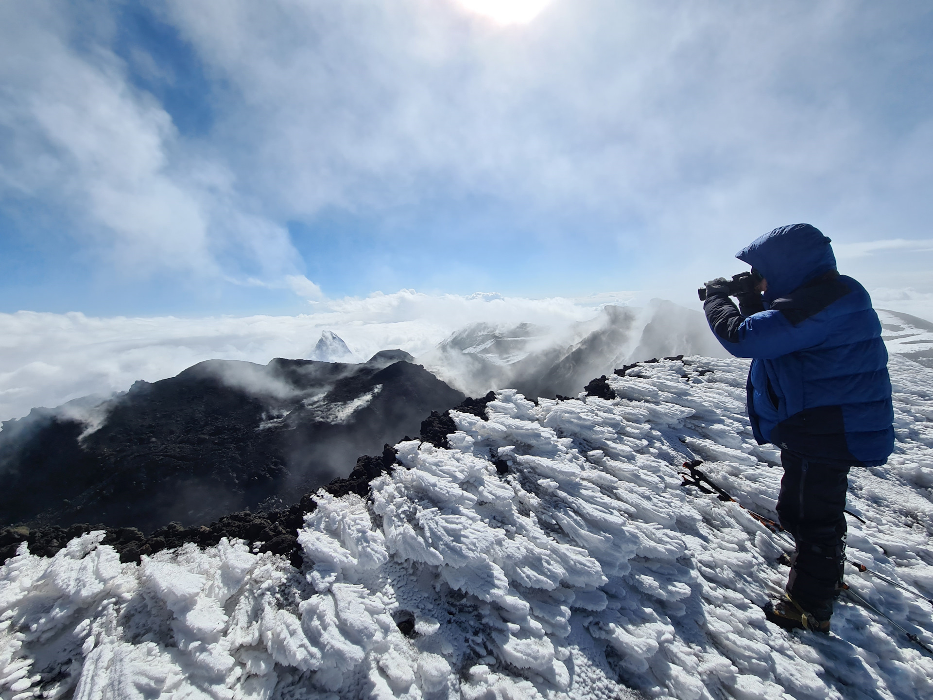 Вдвоем с Ромой мы двинулись выше тропить по снегу. Как вулкан постепенно наполнялся лавой перед извержением, так и во мне копились ожидания перед выходом к вершине. Что я увижу там? Что услышу? Насколько это опасно? Будет ли там лава? Где я смогу ходить безопасно? Насколько большой этот кратер? Вопросы один за одним крутились в моей голове и переполняли меня. По мере подъема эмоции росли, хотелось с кем-то поделиться! Но Рома шел впереди, а я снимал красивые кадры панорамы вокруг и того, что было под ногами.