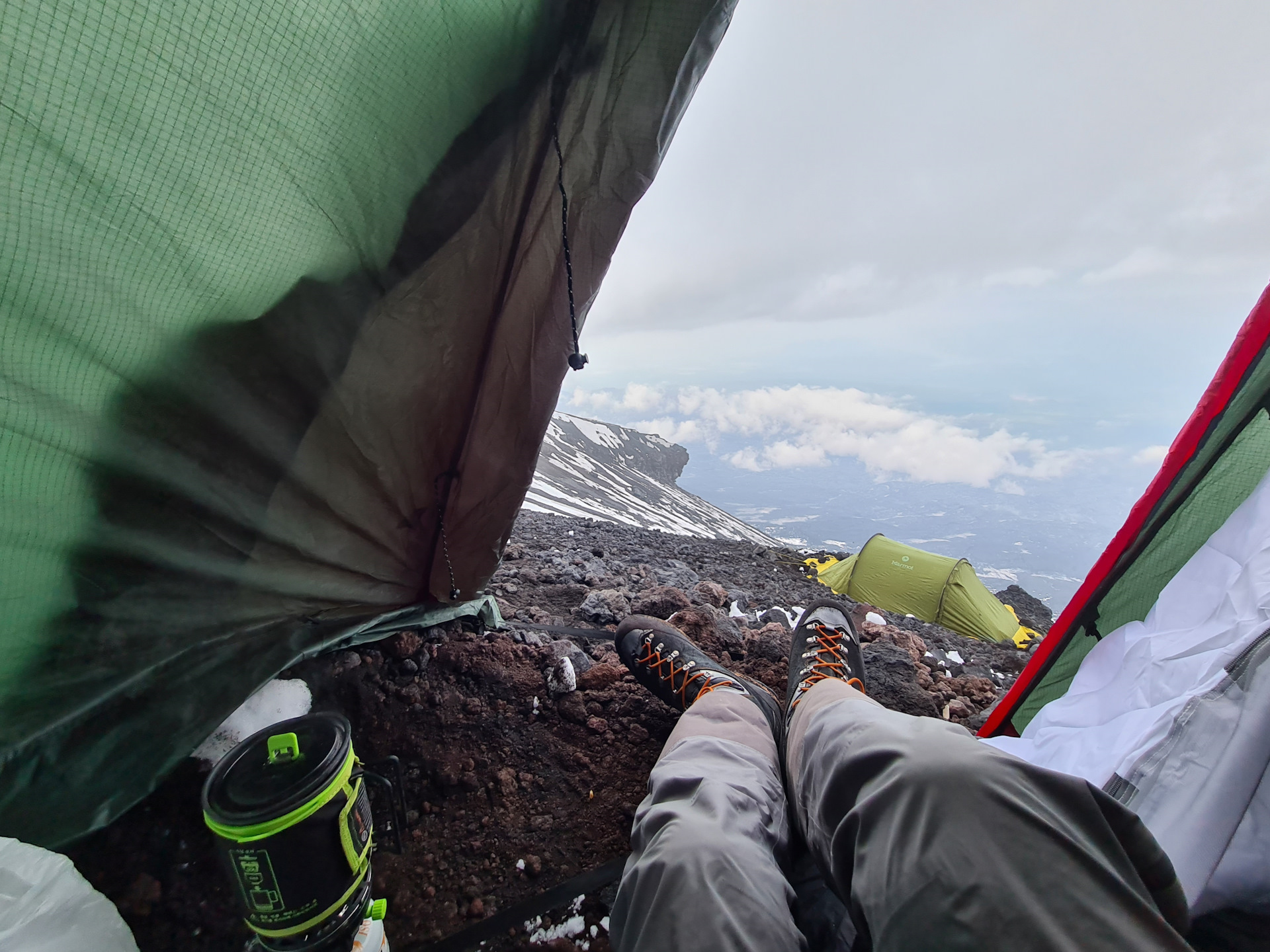 Спустя еще некоторое время видим наши палатки. Время уже позднее, около 9 вечера. На вершине мы были в 5 вечера, то есть штурм занял около 11 часов. Плюс еще час мы тусили там, так что день пролетел незаметно. Заползли в палатки, эмоций, конечно, через край. Хочется все и сразу – кушать, пить, спать, раздеться, согреться и высушить ботинки. Постепенно прихожу в себя и готовлю прохладную водичку, чтобы выпить ее с изотоником. Выпил литр воды и закусил сушеным мясом, мне было достаточно.