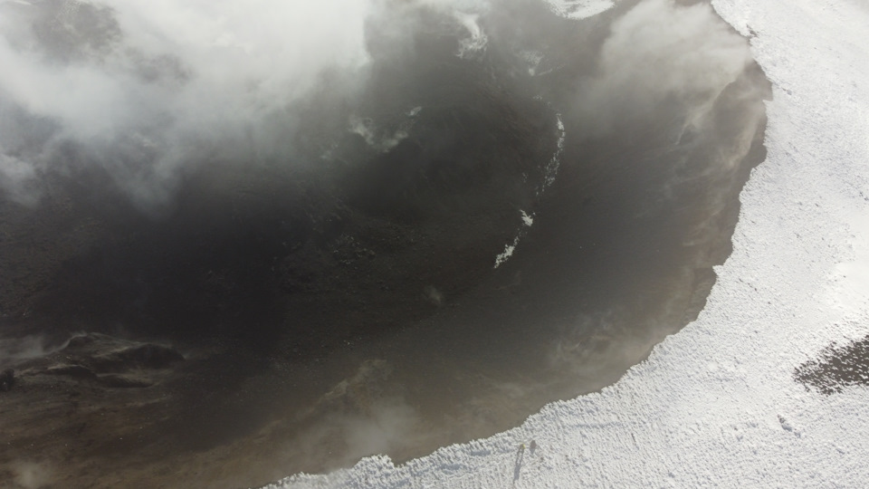 Тем временем Рома делает снимки на камеру вулканологов, а я несмотря на порывистый ветер решаю поднять в воздух коптер! Быстро достаю и собираю малыша, батареи к нему я весь подъем нес внутри куртки. Лопасти быстро раскручиваются, и он тут же начинает колбасится на ветру. Держись, браток! Сейчас будет сильно! И поднимаю его еще выше, где дует очень сильный ветер, и откуда открывается панорама всего кратера. Направляю коптер вперед: лети, лети, мой дорогой! Слышу, как он изо всех сил пытается прорваться сквозь шквалистый ветер, все же ему удается набрать высоту. Сигнал четкий, управление в норме, все зашибись! Адреналина через край, я в диком восторге! Все это еще снимает гопро у меня на шлеме, которую мы включили сразу после выхода на вершину. Как потом оказалось – 27 минут непрерывной съемки! Это просто была мечта – не просто зайти на вершину действующего вулкана, но и заснять это на видео с разных ракурсов.