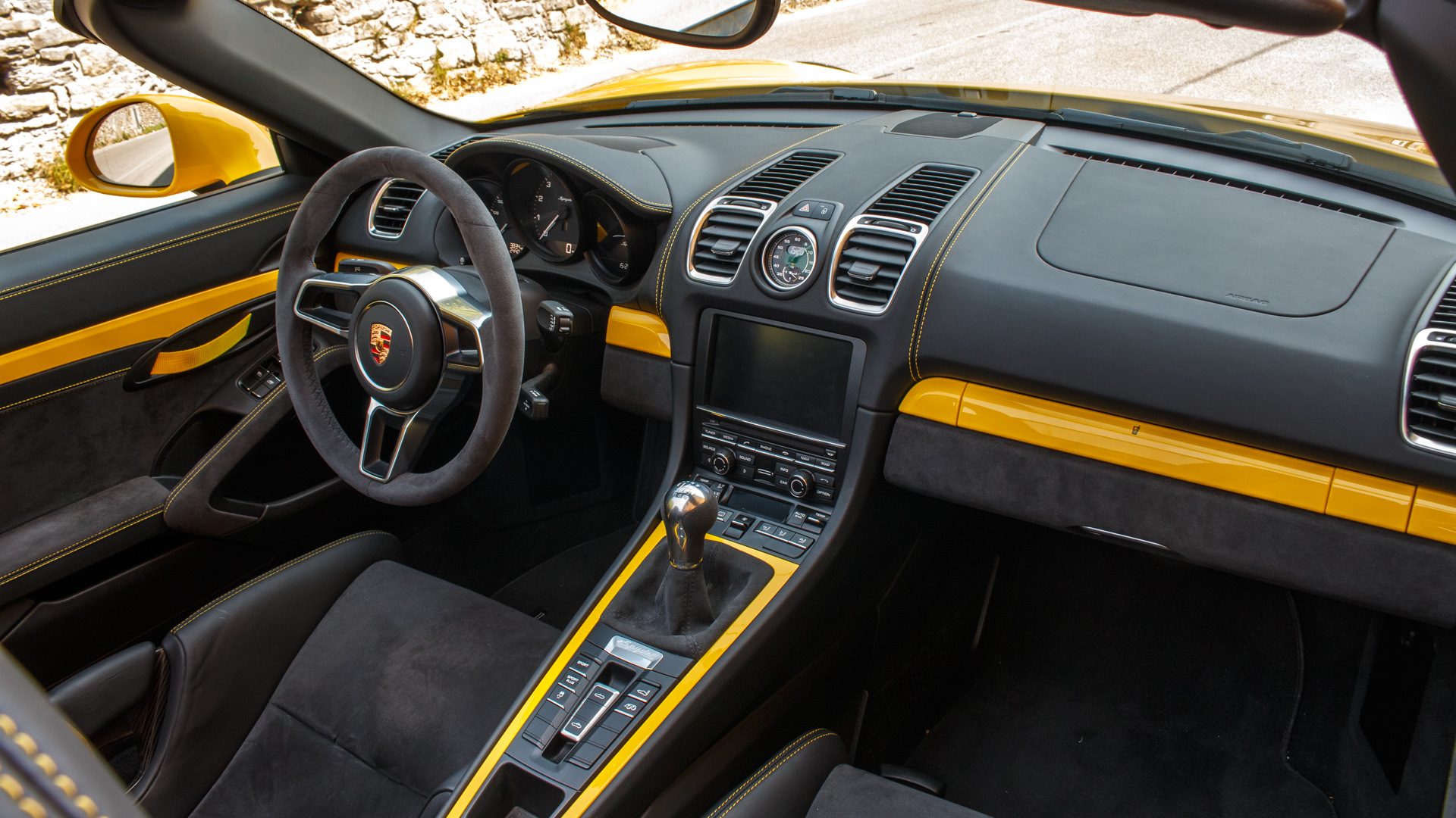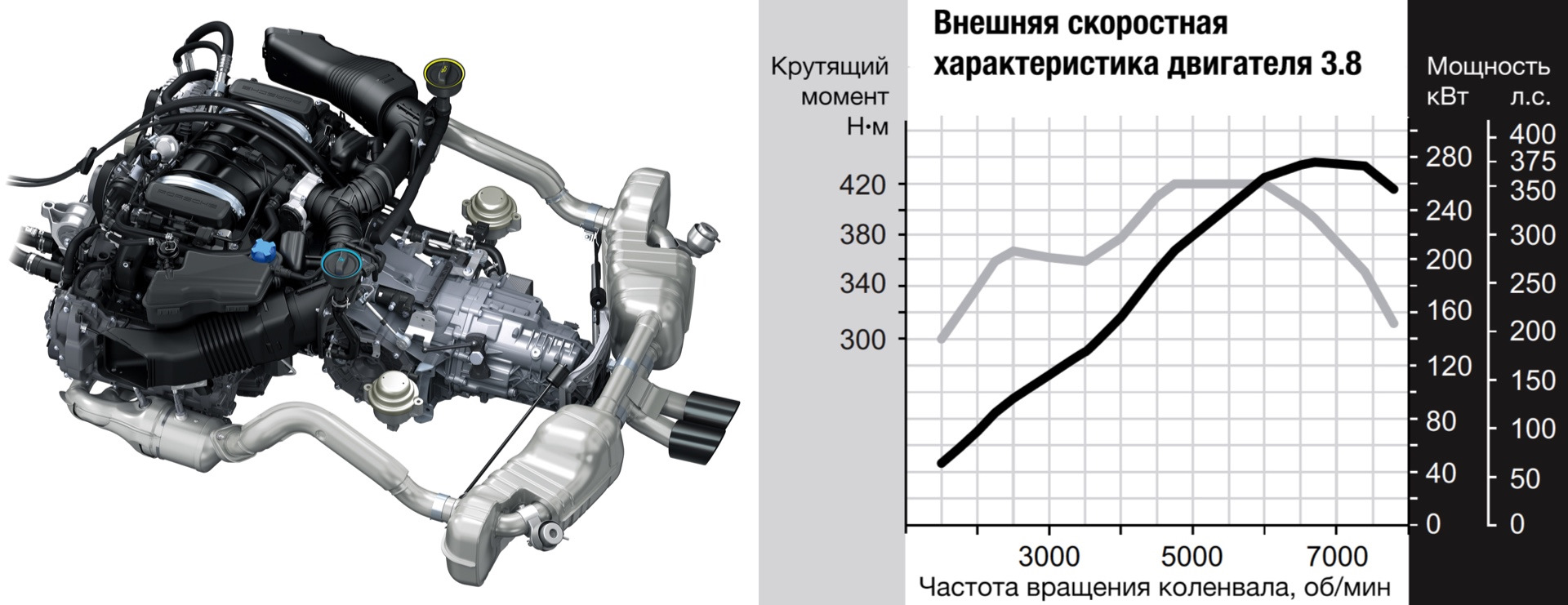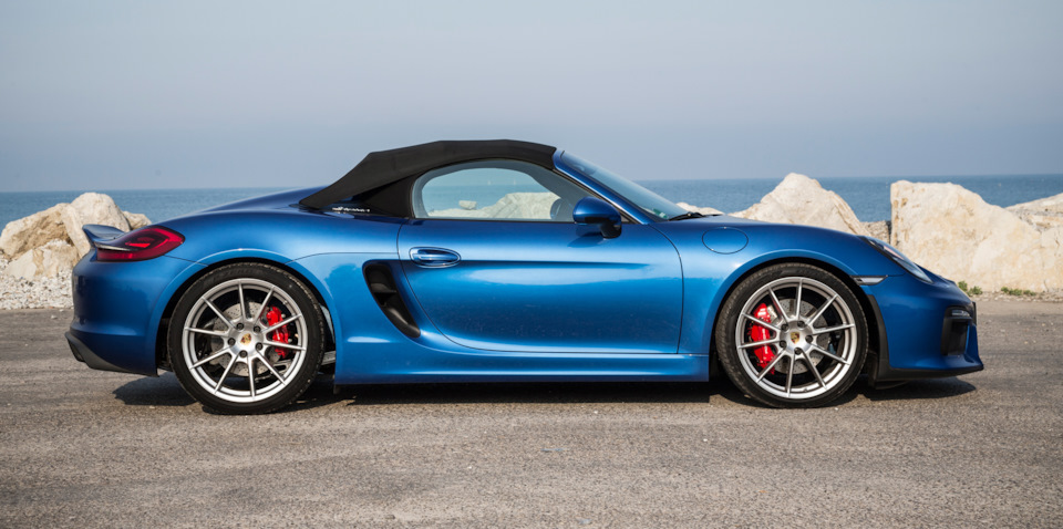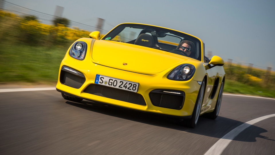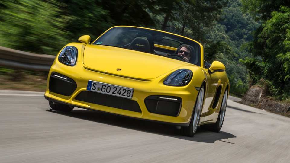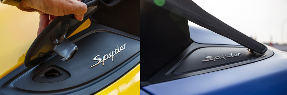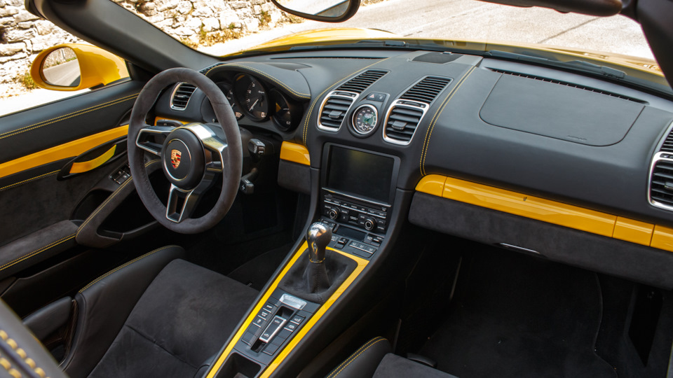 Канонические «горбы» за сиденьями сохранились, но под ними теперь не 320-сильная «шестёрка» Каймана S, а такой же силовой агрегат, как у трекового купе Cayman GT4 — «атмосферник» 3.8 от Карреры S и исключительно шестиступенчатая «механика». На самой «девятьсот одиннадцатой» этот «оппозит» развивает 400 л.с., на Каймане GT4 — 385, а тут на десять сил меньше. Субординация. С другой стороны, 375-сильный Spyder на 45 л.с. мощнее версии GTS с двигателем 3.4.