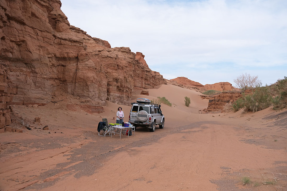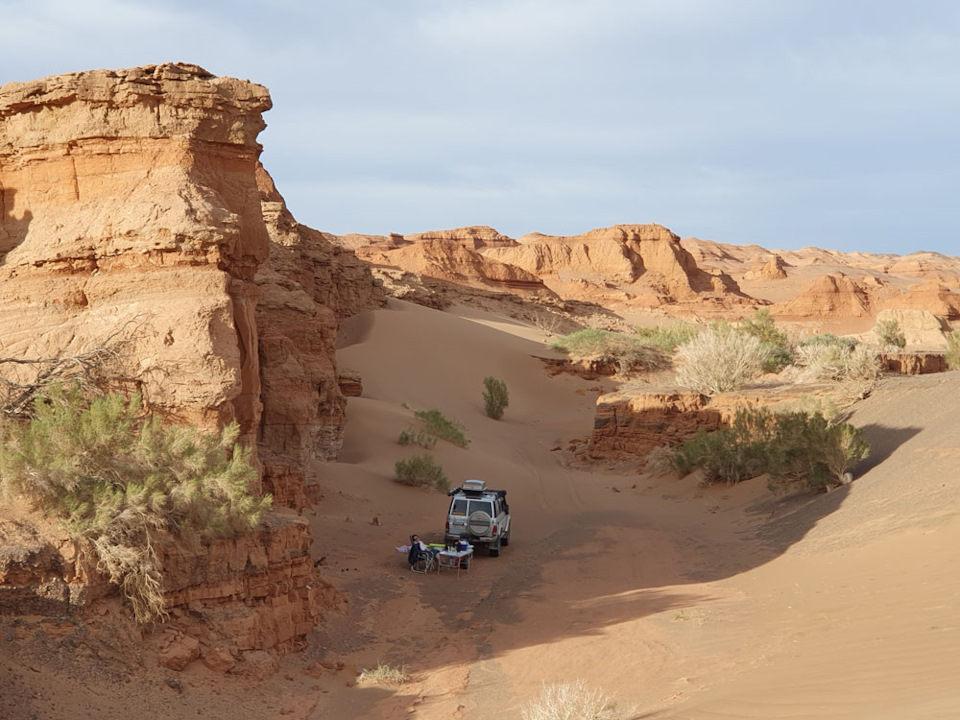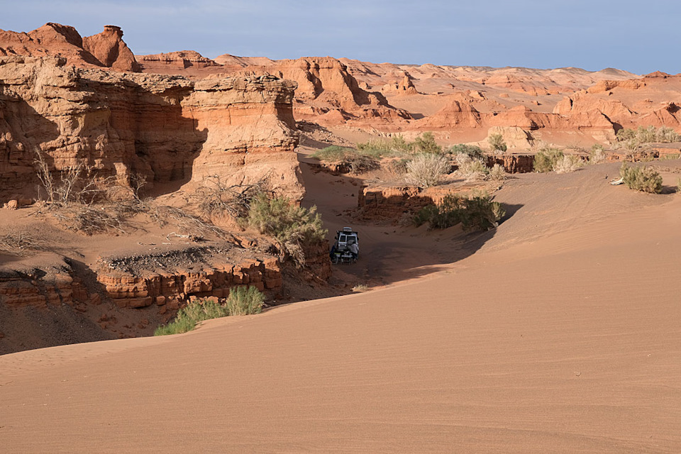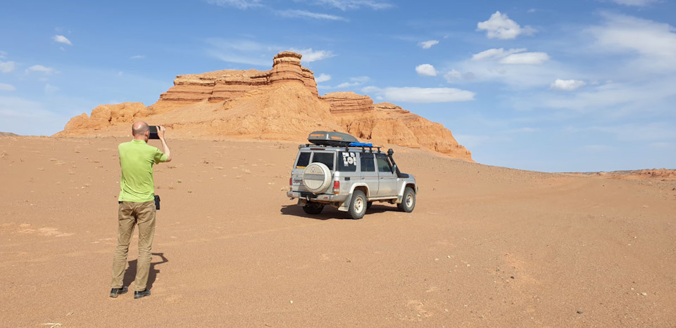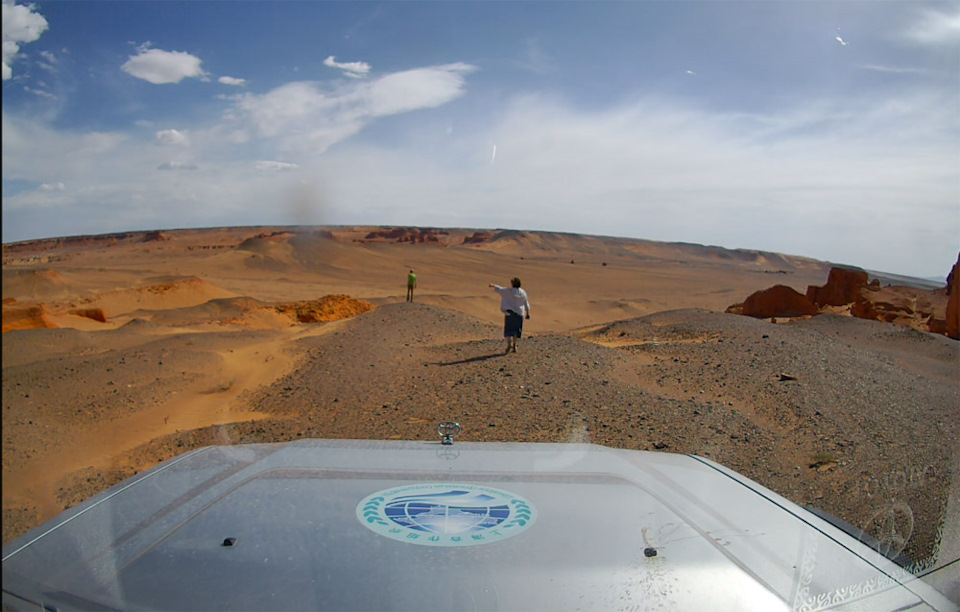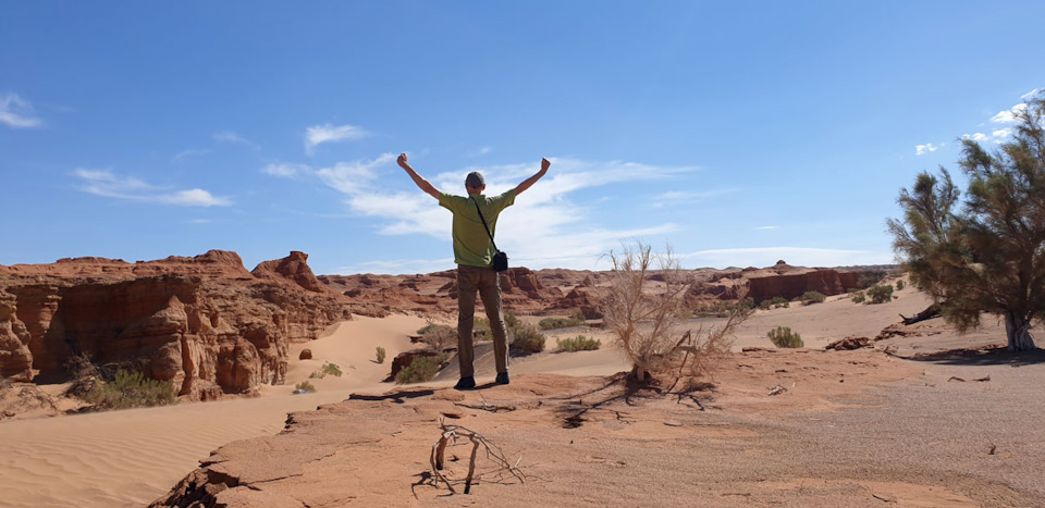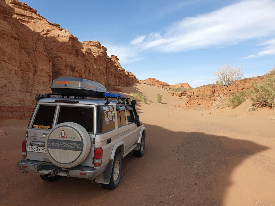 Хэрмэн-Цав для нас незакрытый гештальт. Ещё в 2016 году мы подъехали близко к каньону, доехали до оазиса. Оставался последний рывок. Но выбран был не верный путь, решив обогнуть оазис. Стали всё глубже и глубже уходить в Чёрную Гоби. Тогда со мной был Рав4. Когда же мы решили вернуться на нужное направление, Рав4 сильно пропорол колесо саксаулом в нескольких местах. Поставив запаску выяснилось, что на паркетнике уже не так и много бензина, и доп. канистры может не хватить. Плюс ко всему запаски уже не было, и двигаться без неё был большой риск. В итоге мы вынуждены были распрощаться с таким манящим нас красным каньоном. Но я всегда о нём думал. И вот судьба, спустя восемь лет, опять нас привела к его воротам, к оазису, от которого начинается песчаная дорога в каньон.