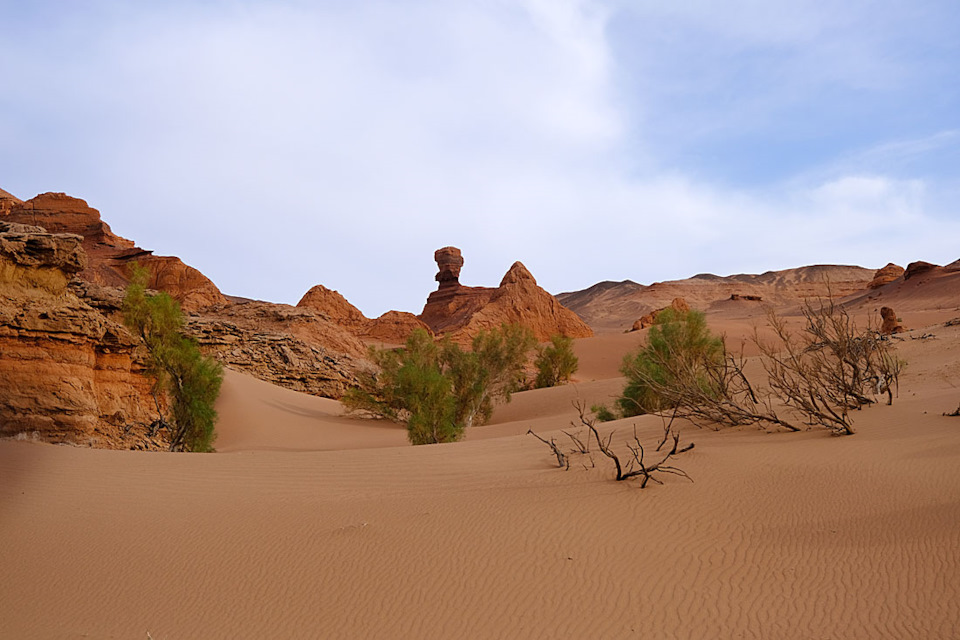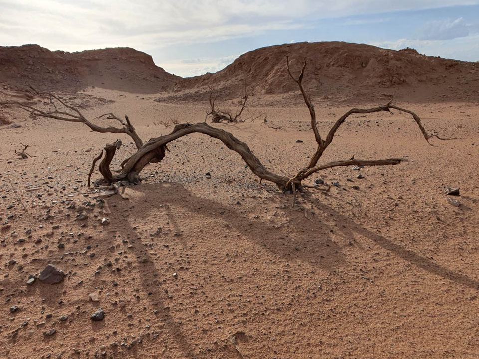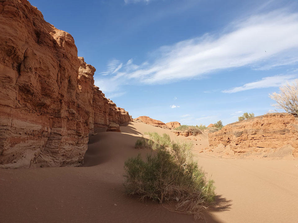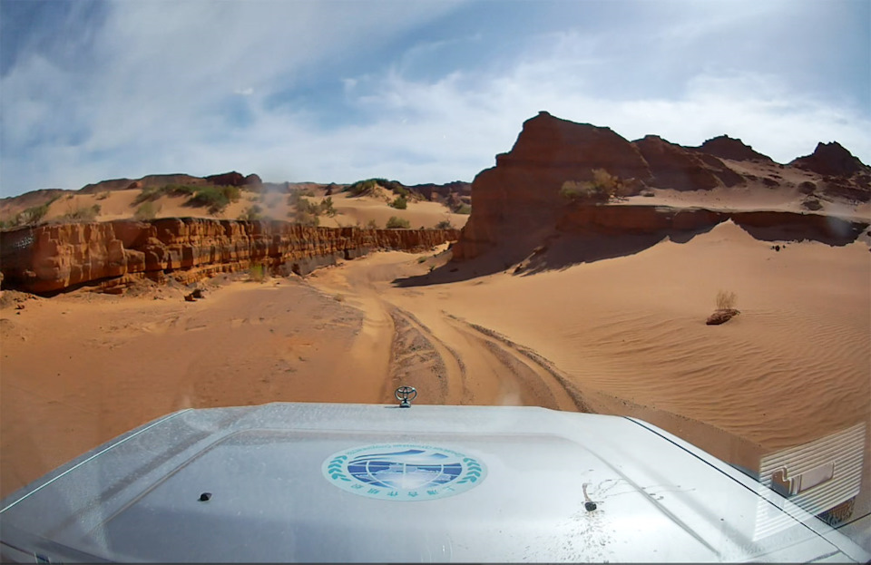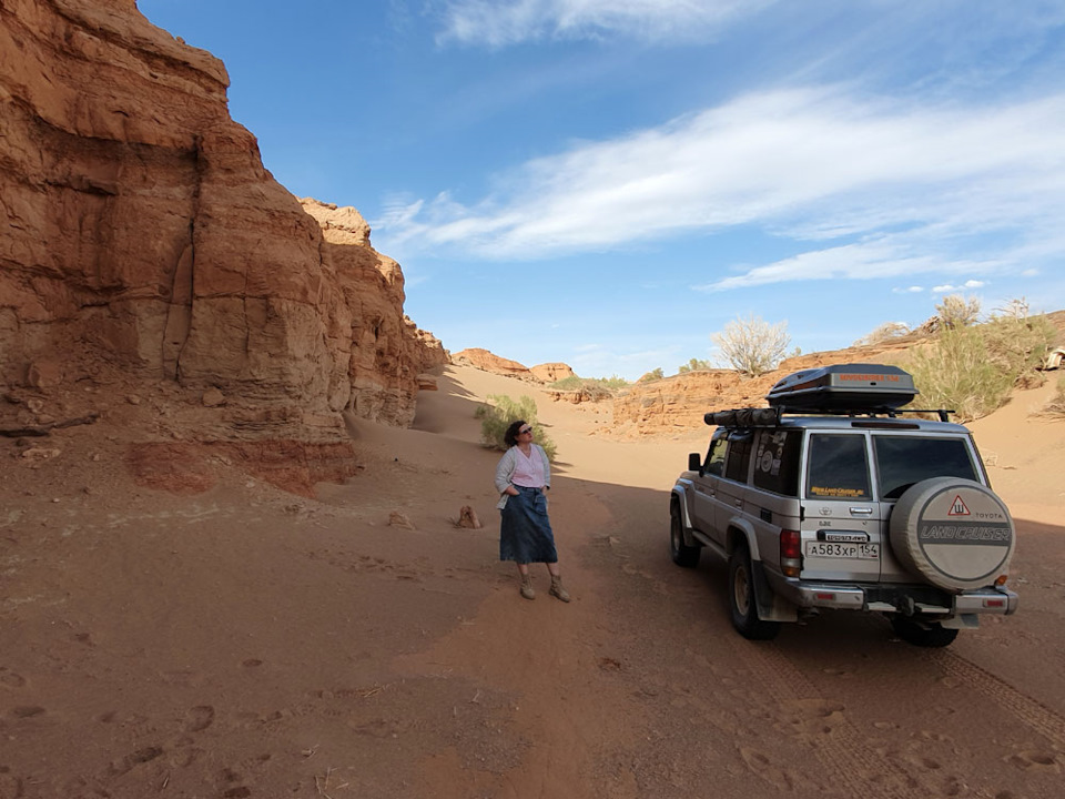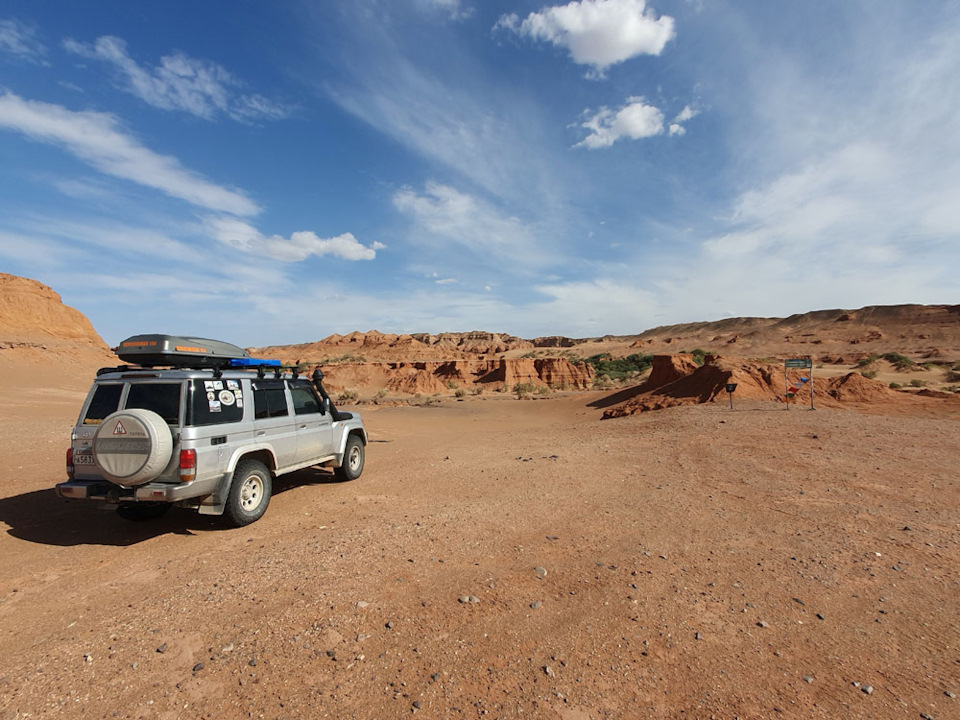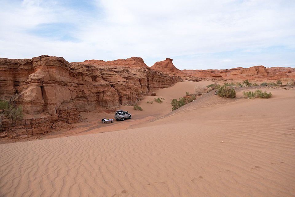 Хэрмэн-Цав для нас незакрытый гештальт. Ещё в 2016 году мы подъехали близко к каньону, доехали до оазиса. Оставался последний рывок. Но выбран был не верный путь, решив обогнуть оазис. Стали всё глубже и глубже уходить в Чёрную Гоби. Тогда со мной был Рав4. Когда же мы решили вернуться на нужное направление, Рав4 сильно пропорол колесо саксаулом в нескольких местах. Поставив запаску выяснилось, что на паркетнике уже не так и много бензина, и доп. канистры может не хватить. Плюс ко всему запаски уже не было, и двигаться без неё был большой риск. В итоге мы вынуждены были распрощаться с таким манящим нас красным каньоном. Но я всегда о нём думал. И вот судьба, спустя восемь лет, опять нас привела к его воротам, к оазису, от которого начинается песчаная дорога в каньон.