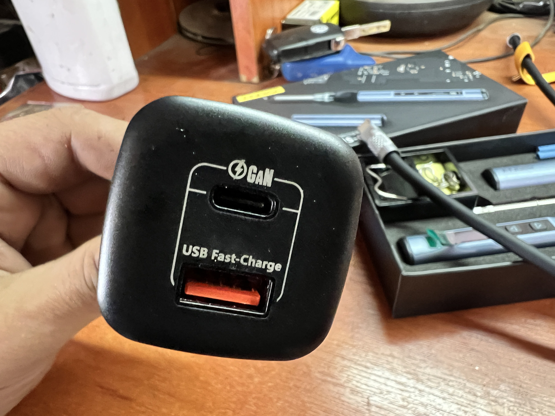 Зарядка в комплекте 65w подключив его к Айфоновской зарядке 20ти ватной я смог переключить паяльник на 9вольт чтоб можно было пользоваться в машине от зарядки телефона у которой есть функция быстрой зарядки 👍👍👍