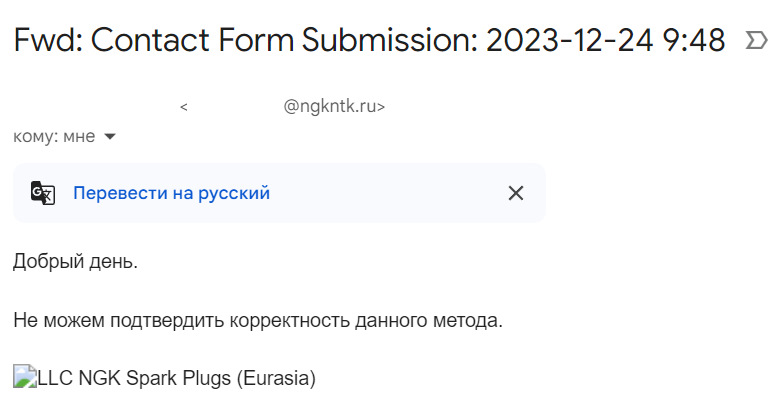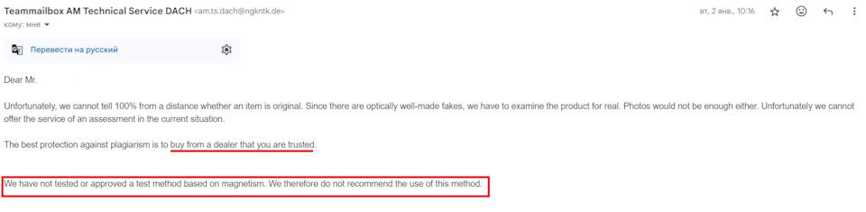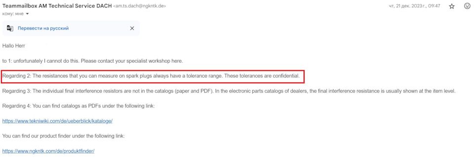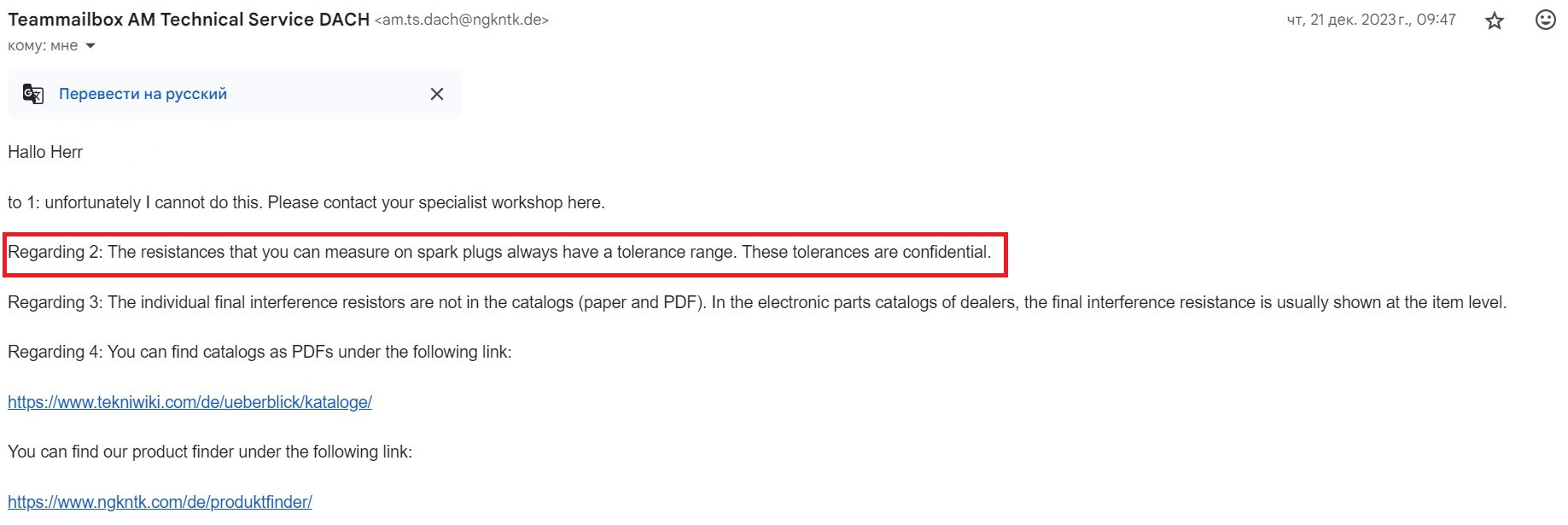 В других видео, в том числе с этого же канала, предлагают измерять сопротивление свечи, чтобы выявить контрафакт. Это имело бы смысл, если бы NGK давали где-то информацию об эталонном сопротивлении. Но такой информации нигде нет. Представители немецкого офиса NGK также упоминают, что эта информация конфиденциальна: