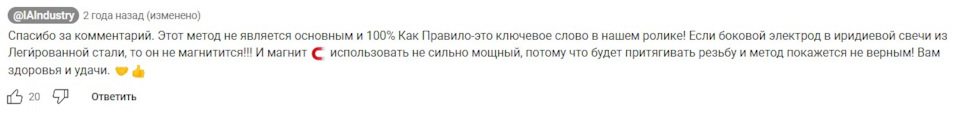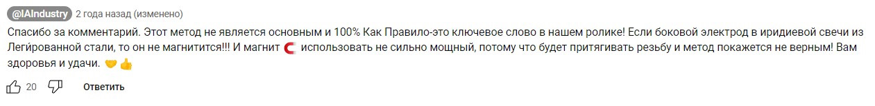 Например, очень популярно видео с проверкой свечей магнитом. На момент написания статьи его посмотрело уже 1.8 млн человек. Основная проблема заключается в том, что этот способ не является надежным. Возьмёте достаточно большой магнит — он притянет и оригинал, и подделку за счёт большого магнитного поля. Возьмёте маленький магнит — он может не притянуть ни одну свечу. У автора видео получилось воспроизвести этот способ на свечах зажигания KIA/HYUNDAI, но непонятно, будет ли это воспроизводиться везде, тем более сам автор до конца не уверен в своём методе: