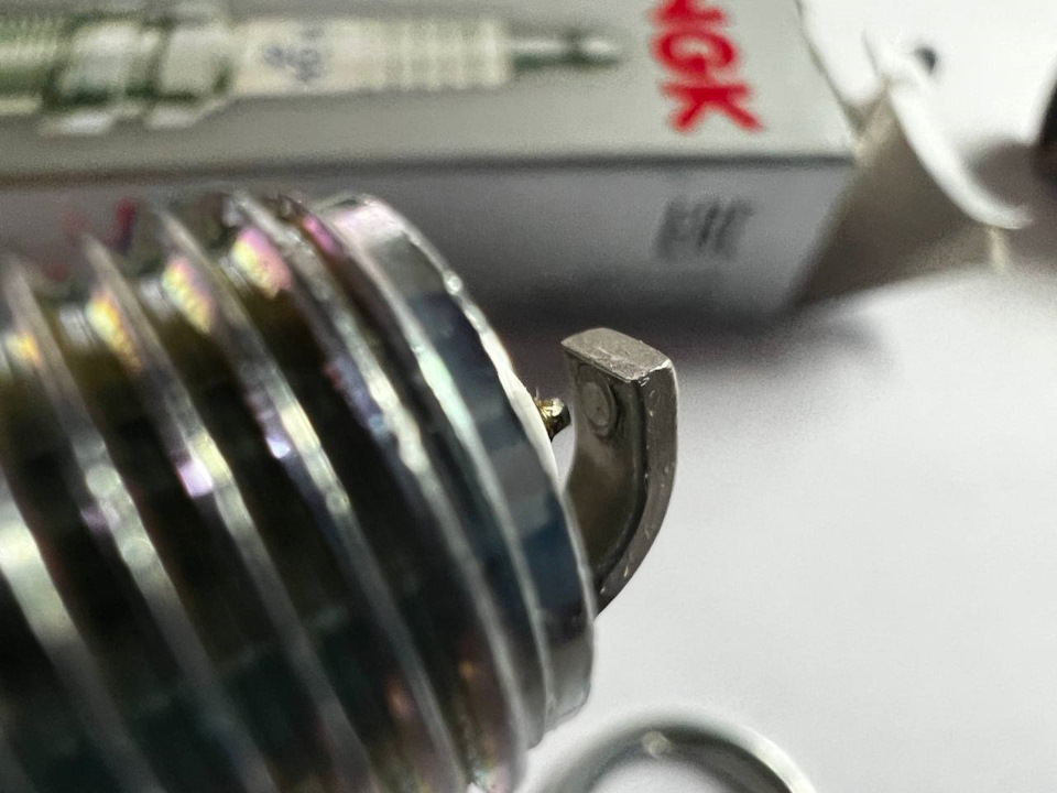 Особенность данной напайки в том, что визуально она представляет собой две точки — одна в другой. Хорошо заметно, что внутренняя точка блестит на свету — это и есть платина. На центральном электроде тоже есть такая напайка.