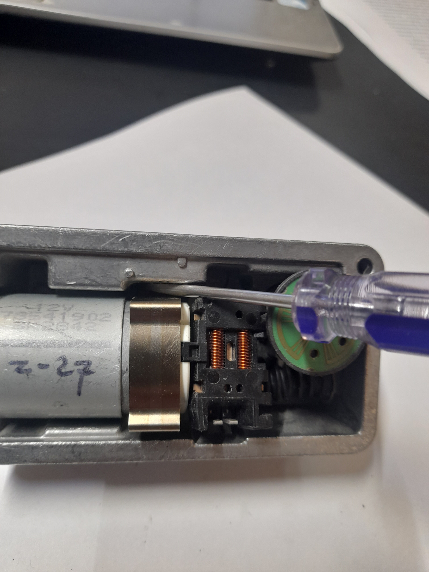 3.Сняв моторчик находим отверстие в которое входит ось червяка, выбиваем ось вставив, что ни будь подходящее по размеру и из твердого металла (например ненужное сверло).