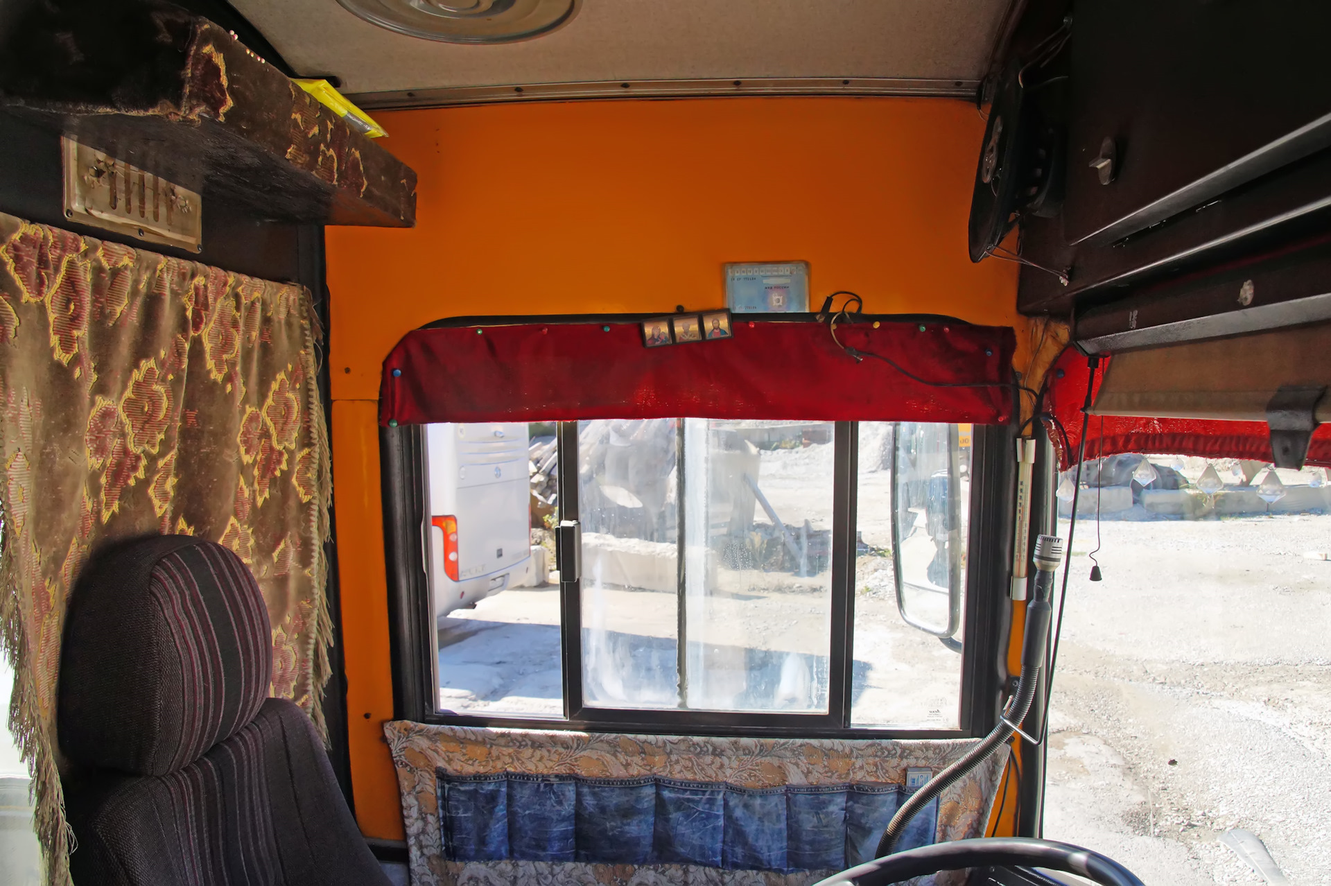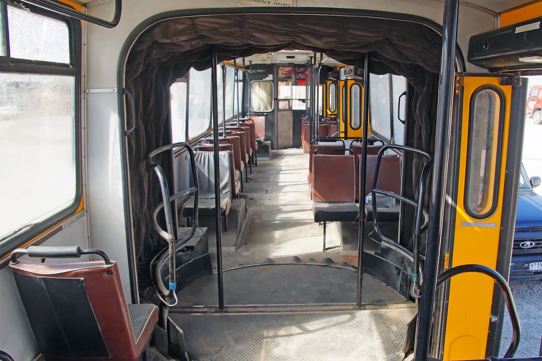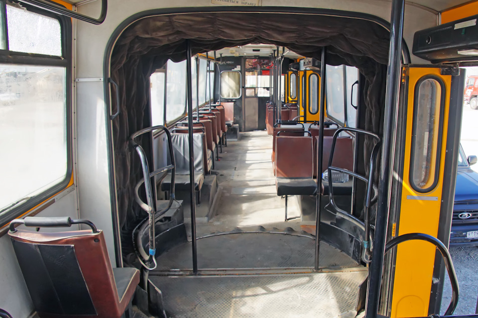 Кабина утеплена оригинально: чтобы её не выстужало через окна до самого потолка, ветровые стёкла выполнены уменьшенными, подобно курганским Ikarus-283.10, а сверху над ними сделан отсек для трафаретов: такой вариант остекления был достаточно редкой опцией. Форточка водителя – также меньшего размера, причём она выполнена двухслойной, а сдвигается только одна из половинок (на обычных Икарусах — подвижны две створки).