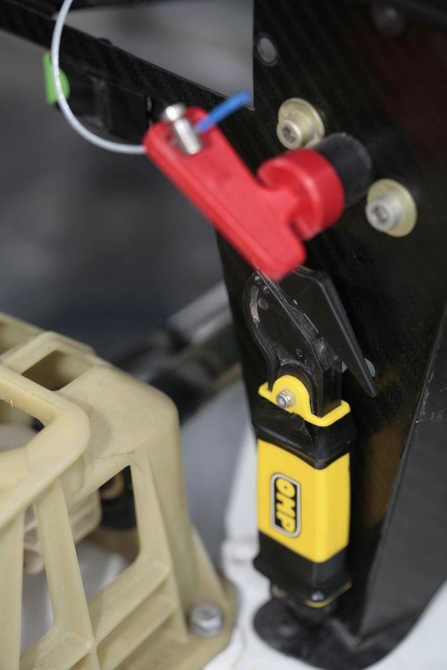 А на этом фото вы можете увидеть сразу два необходимых предмета внутри салона: Стропорез – Если не дай бог экипаж попадет в аварию и будет лишен возможности отстегнуть ремни, эта штука поможет ему выкрутиться. Выключатель массы служит для экстренного обесточивания всего автомобиля. Его привод дублируется снаружи для активации судьями, маршалами или зрителями