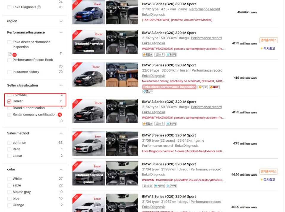 Первым делом определяемся с моделью авто, двигателем, системой привода, годом, пробегом и принципиальными моментами. Заходим на площадку и ставим фильтры, я для примера выберу BMW 3 (скрин 1). Далее выбираем оставшиеся фильтры (скрин 2-3). Появляется список автомобилей, выбираем понравившуюся машину и проваливаемся в карточку. Здесь необходимо обратить внимание на комментарии продавца и две вкладки (скрин 4). Переходим на вкладку Performance check, обращаем на дату первой регистрации, желательно, чтобы машина попадала в диапазон 3-5 лет по возрасту, так наиболее выгодная растаможка в РФ. Дата первой постановки авто на учет и дата выпуска будут всегда различаться, это надо обязательно учитывать для подсчета таможни. Точную дату выпуска автомобиля можно проверить в специальных программах по расшифровке ВИН номера машины. Немного ниже, можно посмотреть схему повреждения кузовных деталей (скрин 5-6), если таковые имеются. Затем необходимо посмотреть историю выплат по страховке, для этого переходим во вторую вкладку Insurance history. Здесь много интересной информации, основное-это страховые выплаты, смотрим на их количество и суммы, если они есть и они небольшие, то это не значит, что машина билась! Не забывайте, можно по КАСКО восстановить шины, стекла, бампера и т.д. Далее все это проговаривается с будущим владельцем машины и после его согласования, на следующий день отправляется подборщик для диагностики авто.