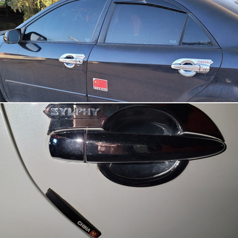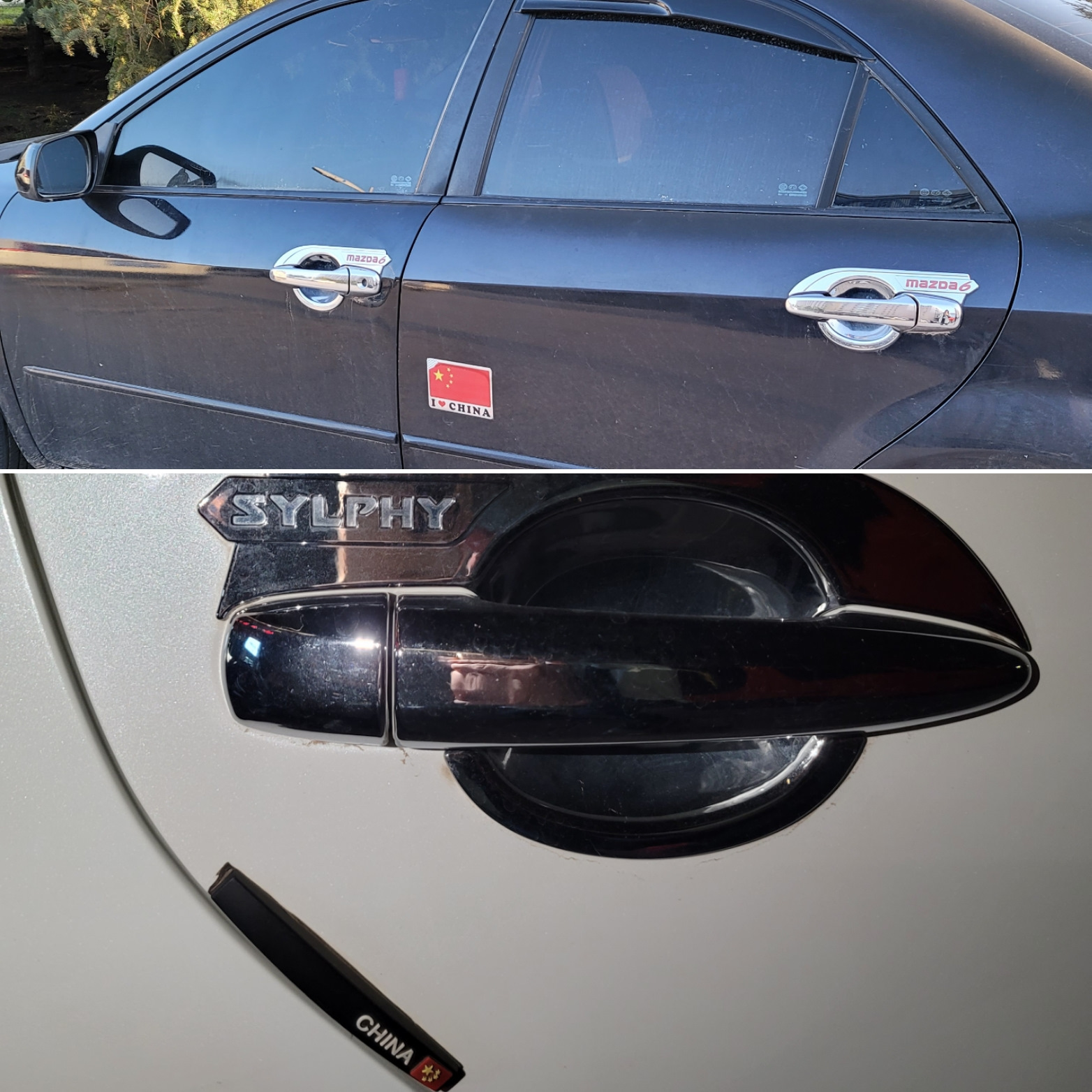 Декор дверных ручек – это само собой. Интереснее наклейки с признанием в любви китайской родине. Они нанесены на машины японского производства, и это местный вариант нашего «можем повторить» и «трофей из берлина» на немецких машинах. Дело в том, что японцы обижали китайцев в военных конфликтах, прошлого, поэтому последние так высказывают своё фи