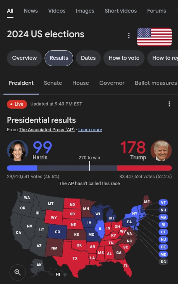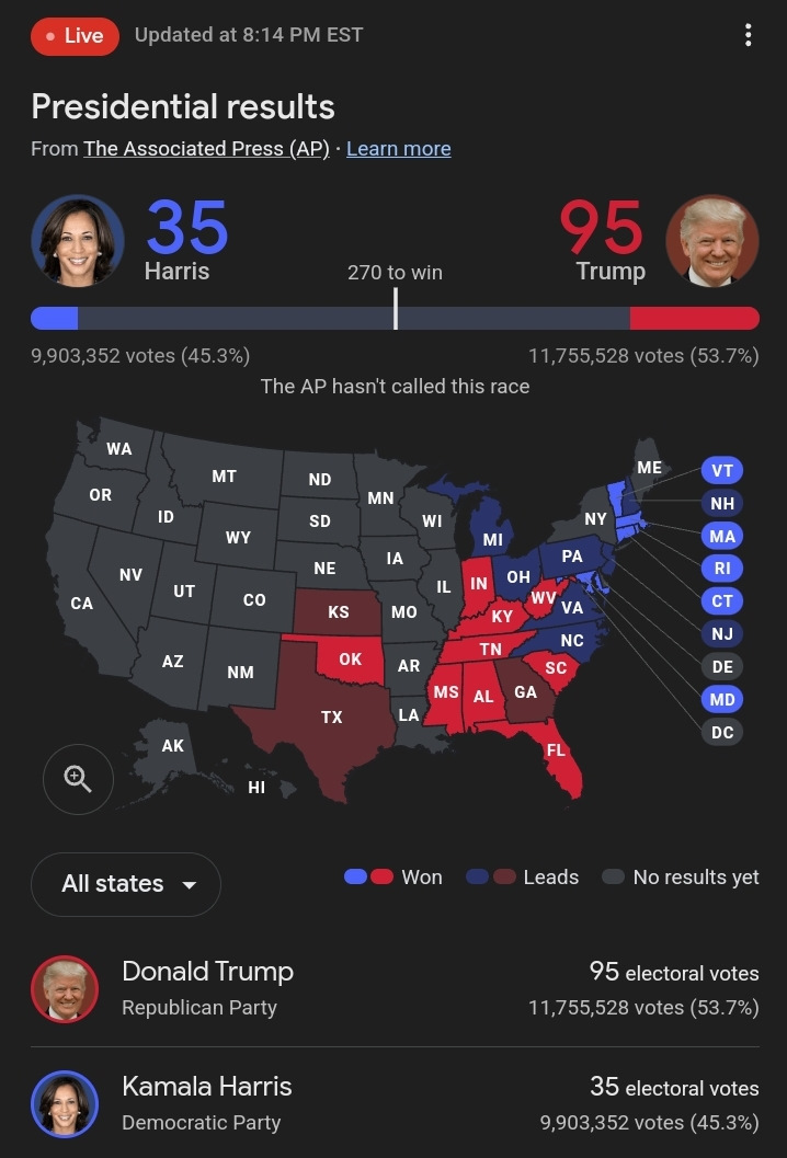 Пошел делать попкорн. По выборщикам пока Трамп лидирует уверенно, но по голосам не прямо очевидно.