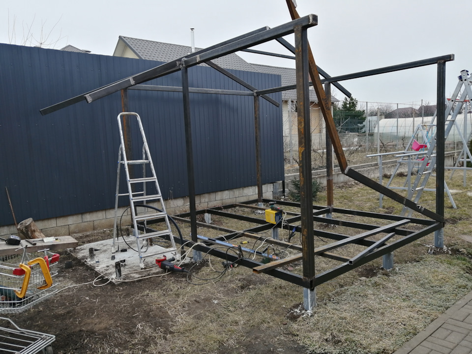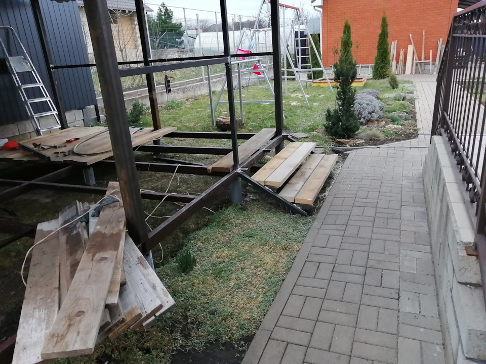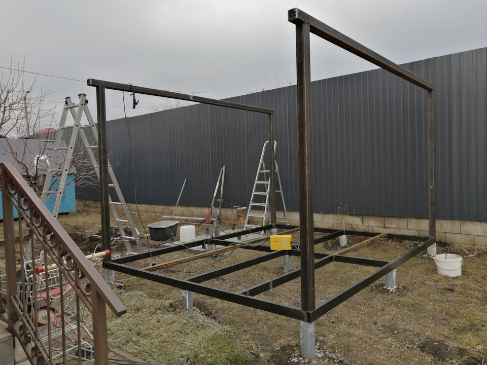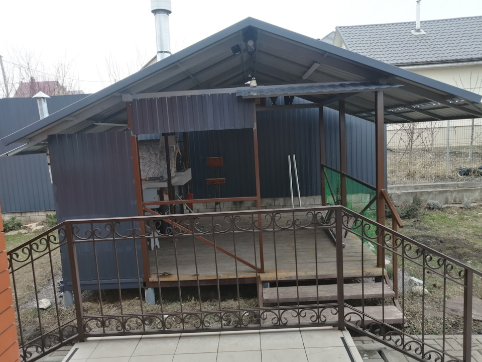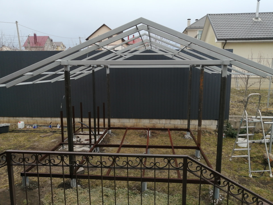 Площадь беседки по настилу 4х3.6м.Крыша -плюс 600мм в каждую сторону. Материал-проф. труба, размер — 80х80,60х80,40х40,20х40. Кровля -профлист С20 в цвете 7024 по Ralу, графитово-серый. Основание — бетонные столбы 100мм заглубленные на 90см. Беседка займет пространство от края дорожки вокруг дома до забора с соседом, с отступом 1 метр.