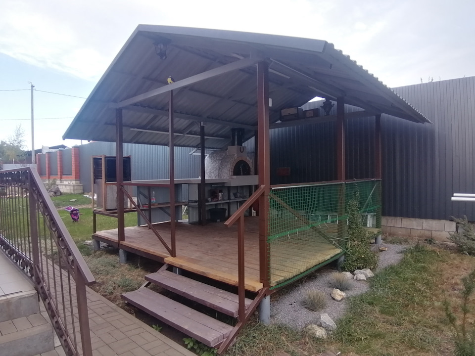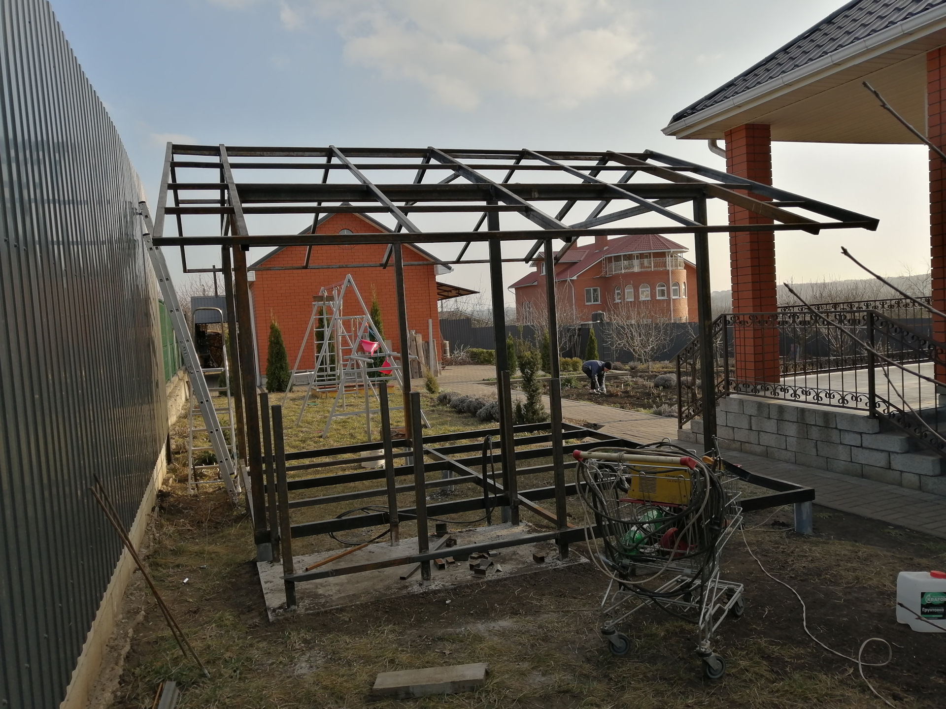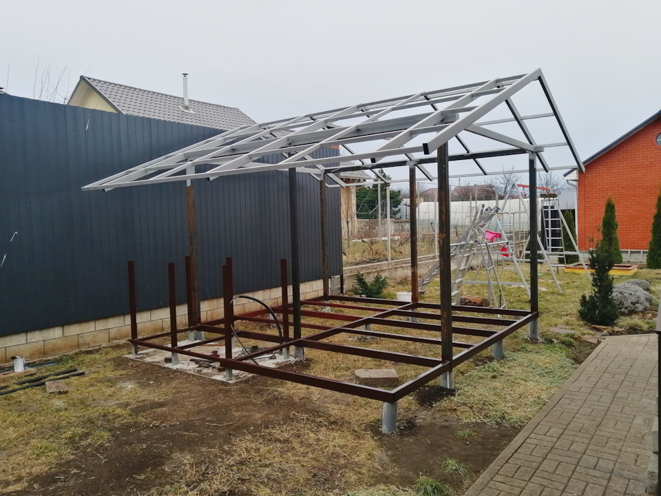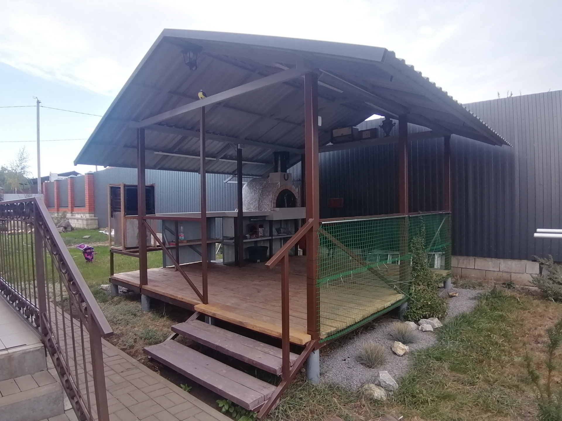 Площадь беседки по настилу 4х3.6м.Крыша -плюс 600мм в каждую сторону. Материал-проф. труба, размер — 80х80,60х80,40х40,20х40. Кровля -профлист С20 в цвете 7024 по Ralу, графитово-серый. Основание — бетонные столбы 100мм заглубленные на 90см. Беседка займет пространство от края дорожки вокруг дома до забора с соседом, с отступом 1 метр.