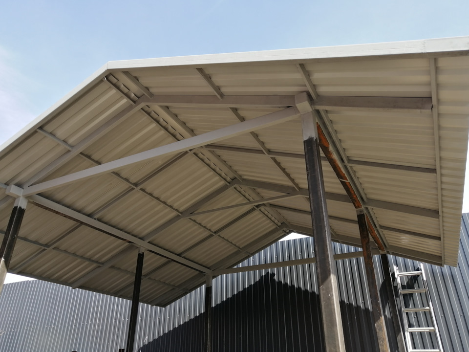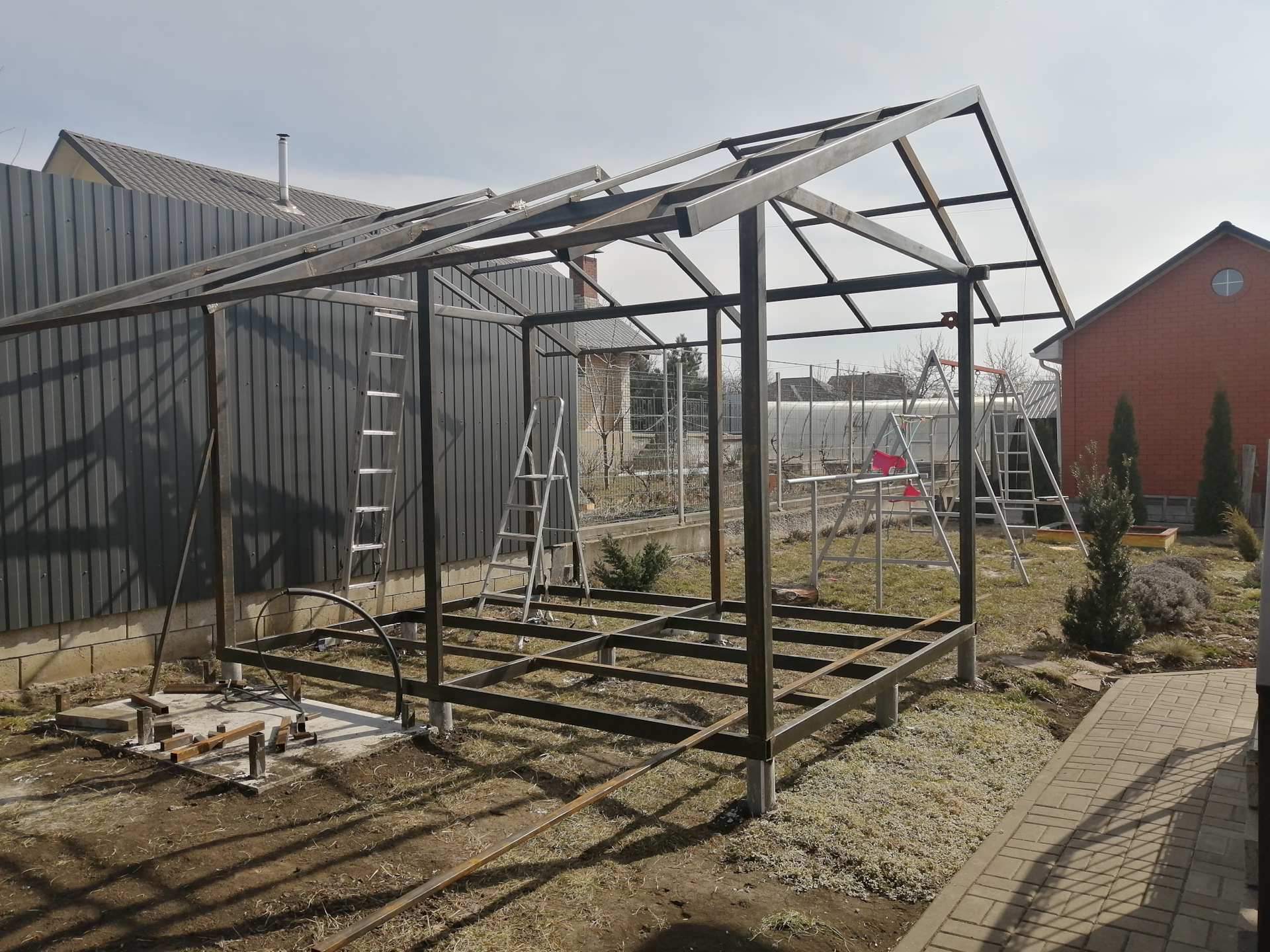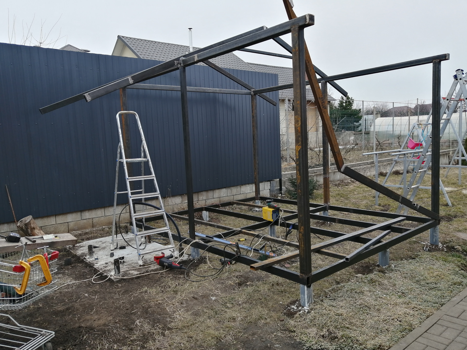 Три стропилки из трубы 80х40 с затяжкой и упором на вертикальные стойки. Между ними две стропилки из трубы 40х40. Вырезал трубу 80 х40 в месте контакта с горизонтальной трубой так, что бы 40х40 не пришлось вырезать, когда её ставлю. Стропила соединяю трубами 40х20.