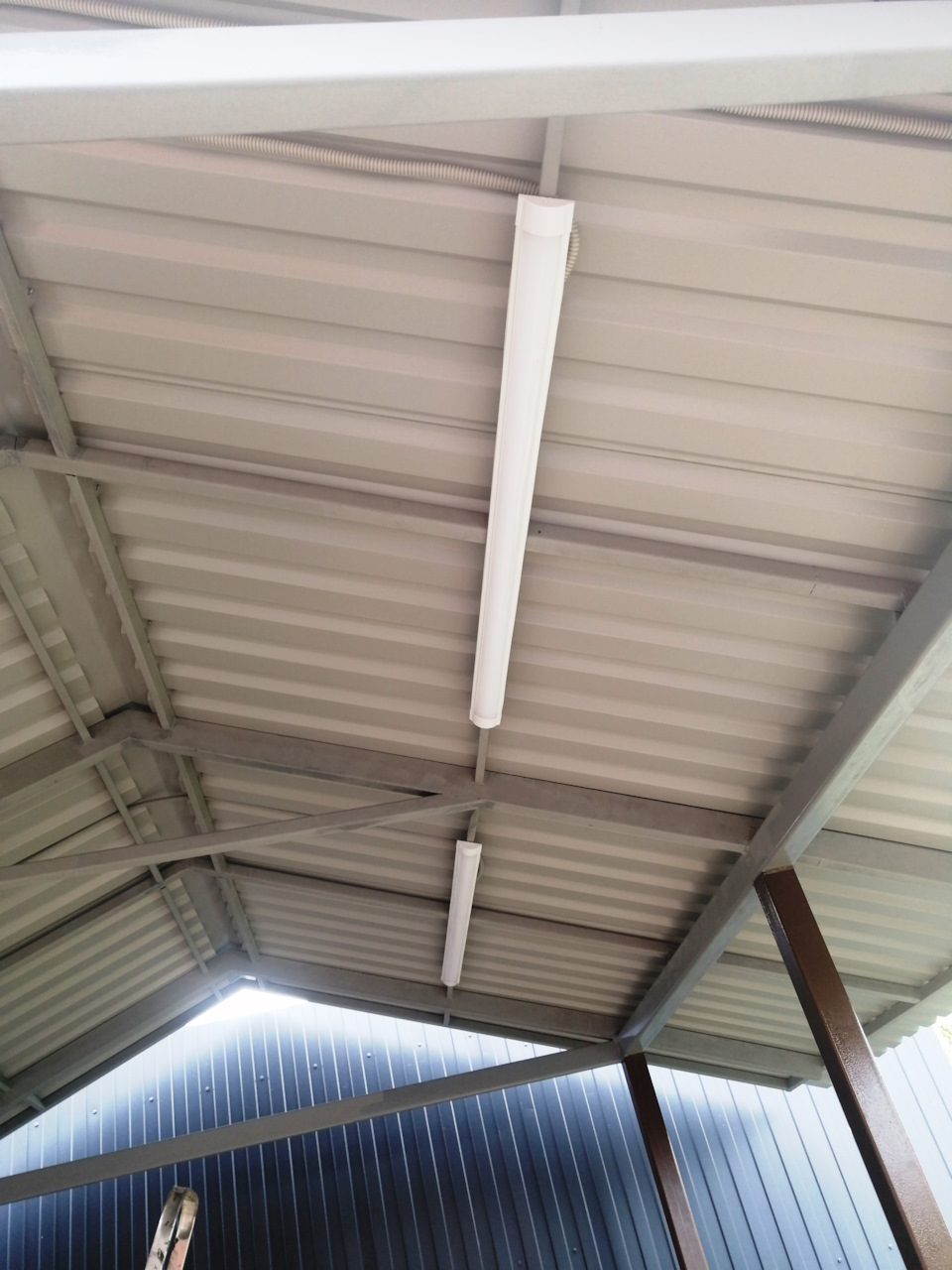 И так все листы. Скат не большой, с помощью доски с поперечинами, не сложно конек прикрутить. Так быстро все произошло, что не успели сфотографировать. Конек крепил теми же саморезами, что и кровлю к профтрубе. Всего на крышу ушло 250 саморезов. Потолок получился светлым, как хотели. В одном тоне.