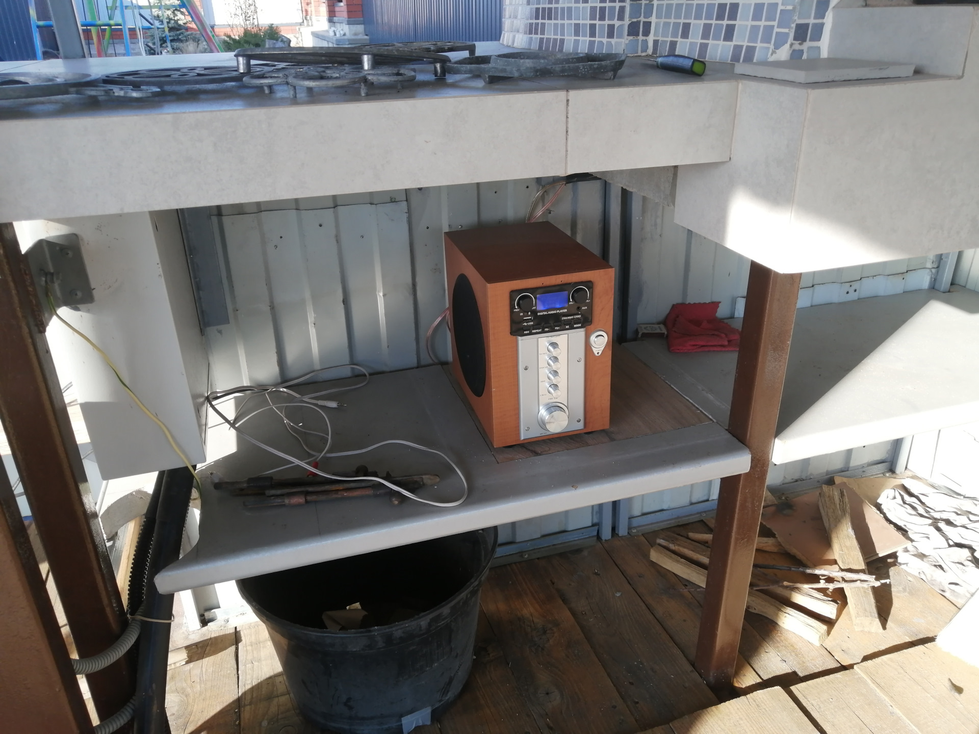 Провел проводку в гофре, поставил розетки. Свет включается в двух зонах. Над столешней и вверху. Все разместил повыше, что бы влага нигде не попала.