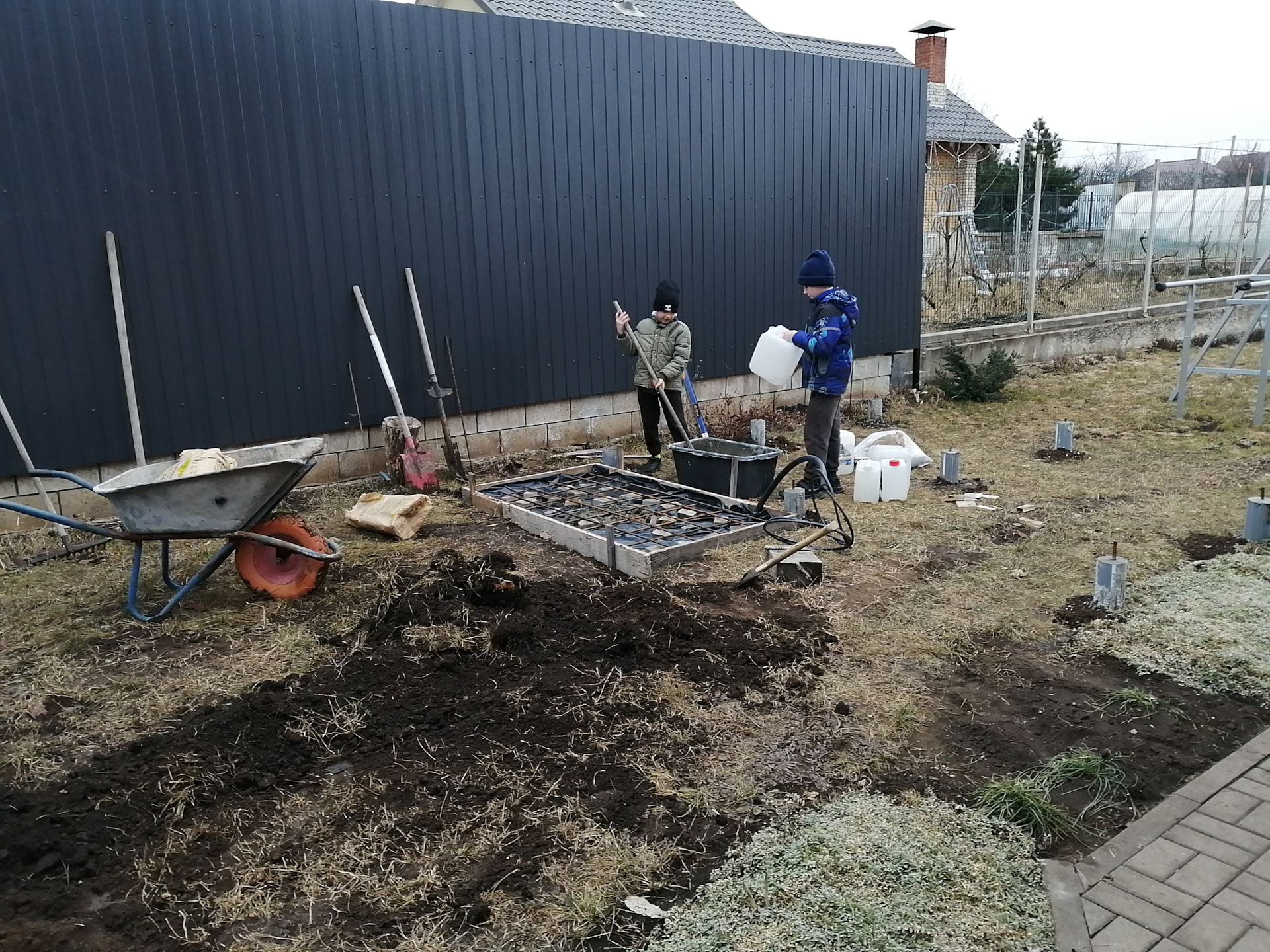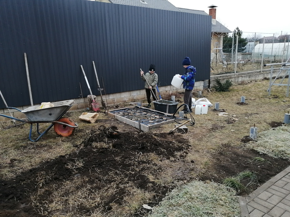 Размечаю и сверлю ямы для столбов. Бур где то 180мм в диаметре. Сверлю до ручки, заливаю цементно-песчаную смесь М300 до половины. Вставляю канализационную трубу длинной 1 метр, иногда приходится постукивать по ней. Заливаю оставшееся место ЦПС, вставляю арматуру-3 прута 10мм по 1 метру, и один прут 14 мм, длинной 600мм. с наваренными поперечинами, что бы не проваливалось. Четырнадцатая арматура торчит на 80мм. Уровни по лазерной прибору. Дети привыкают к труду.