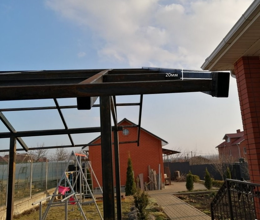 Так называемую, ветровую доску, вварил из трубы 80х40.Это с лица беседки. С подъемом на 20мм от всей плоскости крыши. Проф. лист, которым буду крыть крышу, С20, волна 20мм. Чтобы перекрыть неприятные моменты.