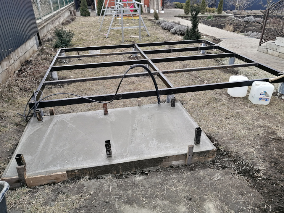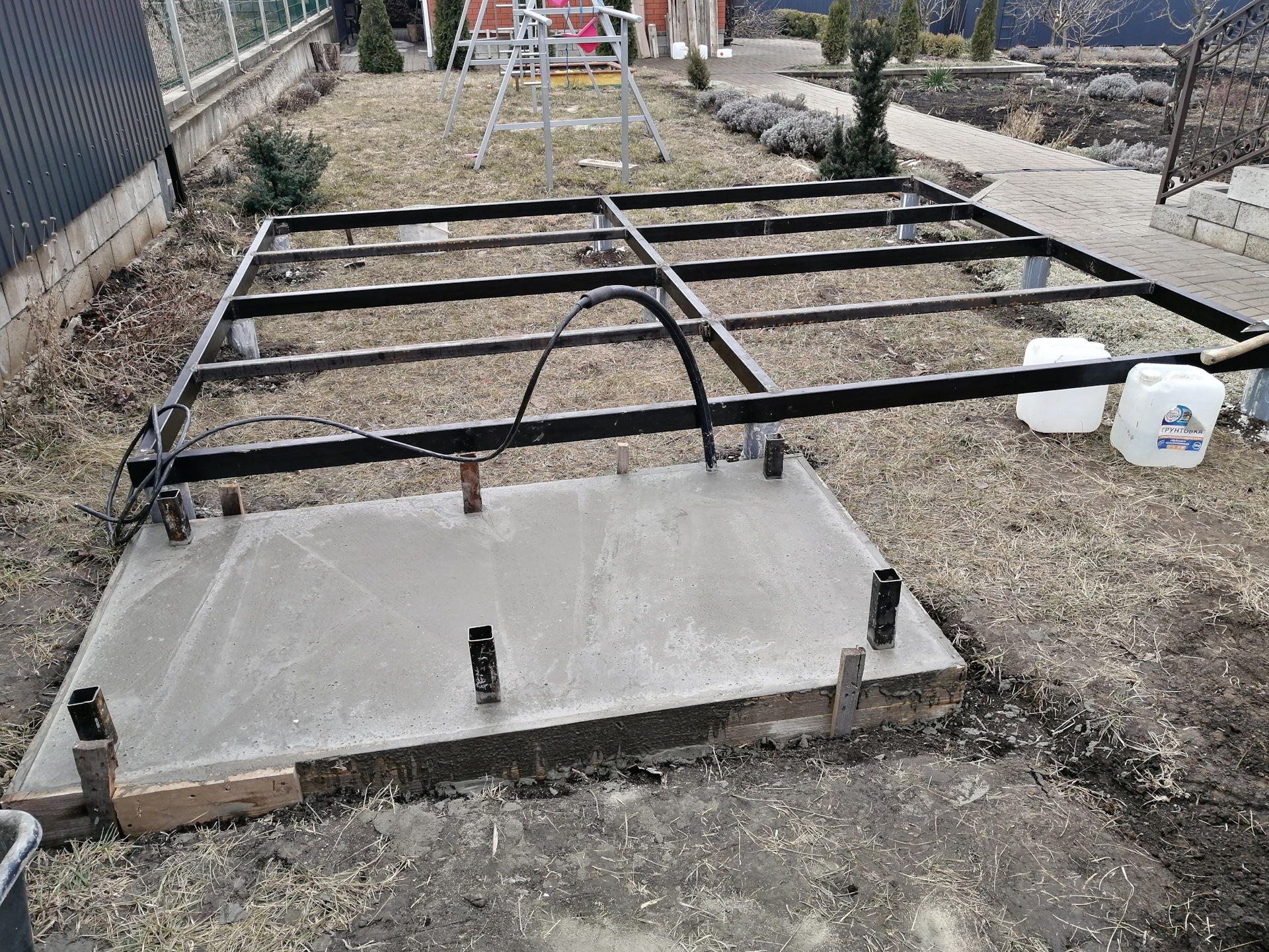 Провел эл. кабель в трубе, залил фунд для помпейской печи. Развариваю по уровню каркас для основания беседки.