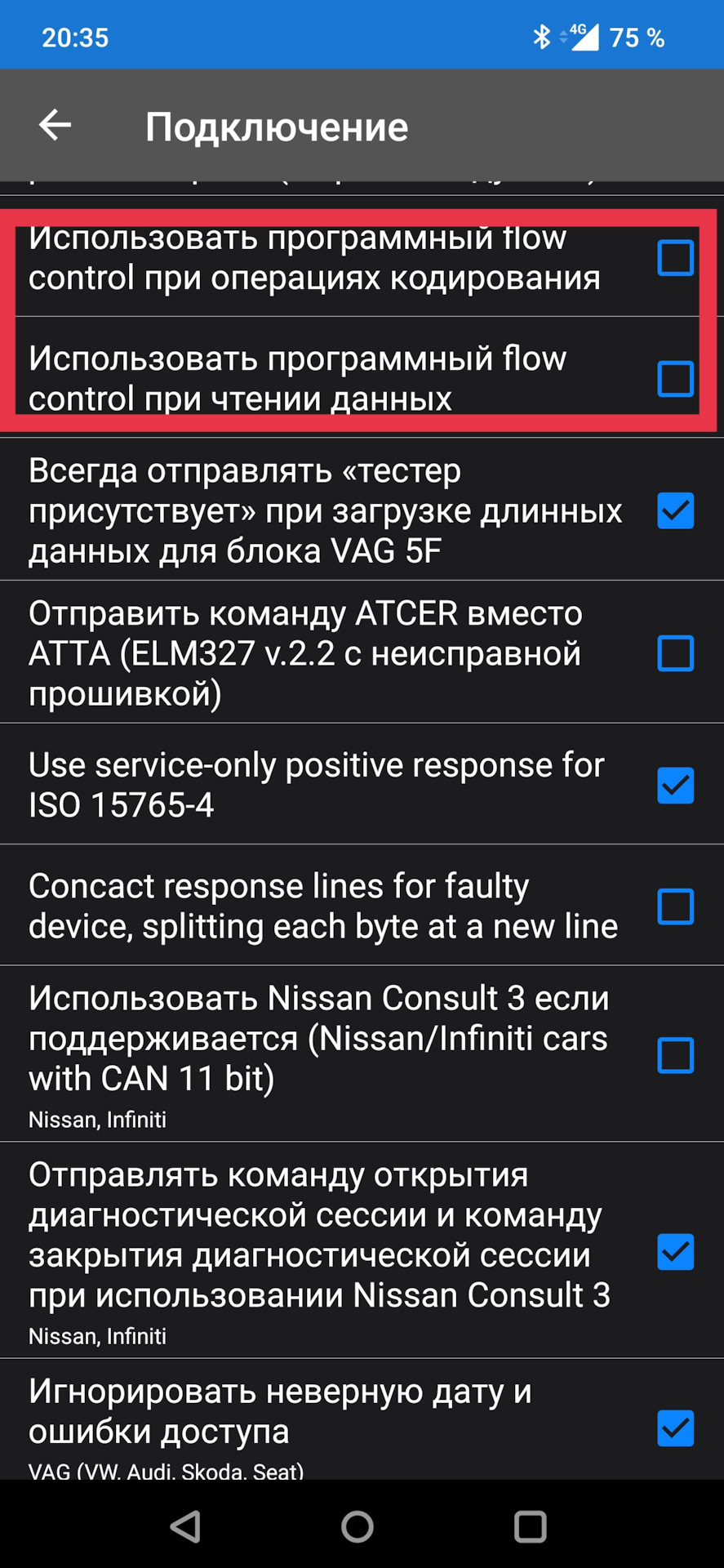 Использовать программный flow control при операциях кодирования и при чтении данных (2 параметра): отключить.