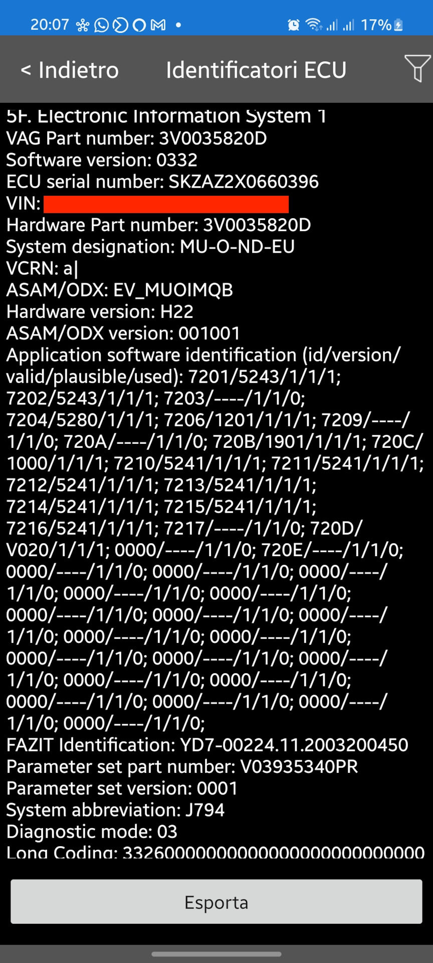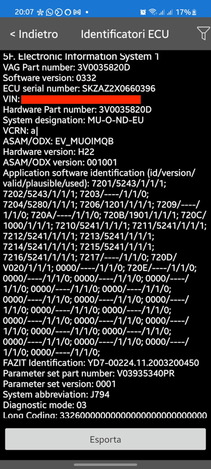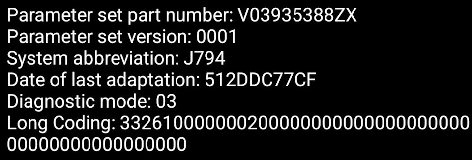 Обратился за помощью к автору-разработчику программы Car Scanner Pro — 0vZ, он спасибо ему большое помог мне и посоветовал попробовать через длинное кодирование прочитать VCRN (В Car Scanner в Идентификаторы ЭБУ — в блоке 5F он называется Unit ID ): зайти в Кодирование и сервис — Длинное кодирование — блок 5F — поставить галочку "Другой идентификатор" и в появившемся поле ввести 3C0A, после чего нажать "Обновить".