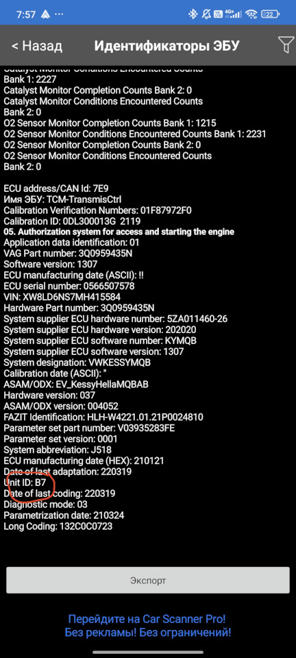 У меня сразу carscanner показал unit id в идентификаторах эбу. Но для подстраховки я всё равно попробовал по способу указанному вами, проверил, он тот же самый номер выдал