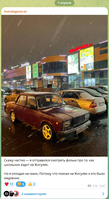 Надо сказать, что фильм не доехал до проката в город Ташкент, где я пребываю в командировке, но благо есть сервисы, которые позволили мне с фильмом ознакомиться. Но пока искал ближайший киносеанс — в шутку вспомнил пост из ТГ-канала камрада vadi17 про то, как он не доехал до кинотеатра, потому что решил поехать туда, собственно, на «Жигулях».
