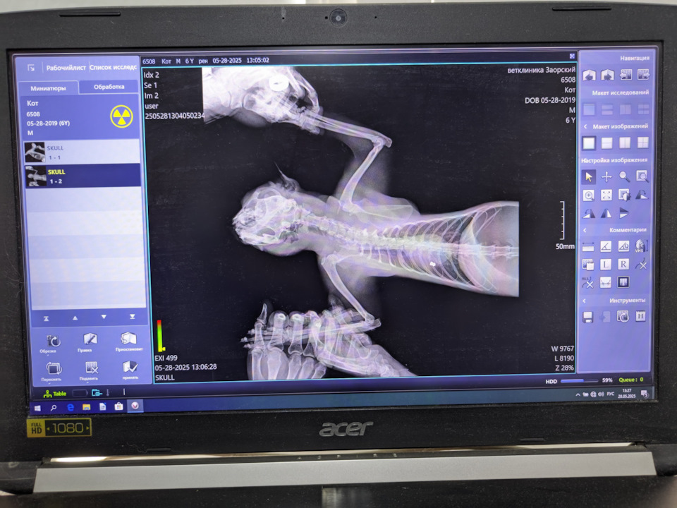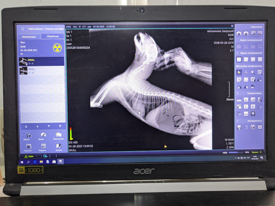 Поговорили с ними. Попробуем лечить, насколько это возможно, конечно. Кот уличный, в квартиру его никак, переноска мягкая, хоть и крепкая. Выдали мне перчатки. Держал. В принципе, на рентгене видно, вдвоем держали. Пакет уколов от инфекции, плюс сердечное, плюс 60 кубов глюкозы…