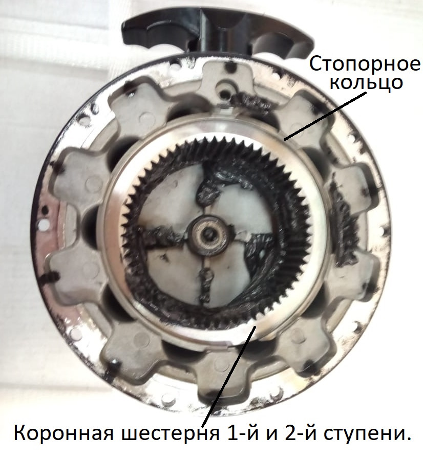 Коронная шестерня 2-й и 1-й ступени на месте, которая зафиксирована в крышке стопорным кольцом. Так же именно эта коронная шестерня отвечает за свободную размотку троса.